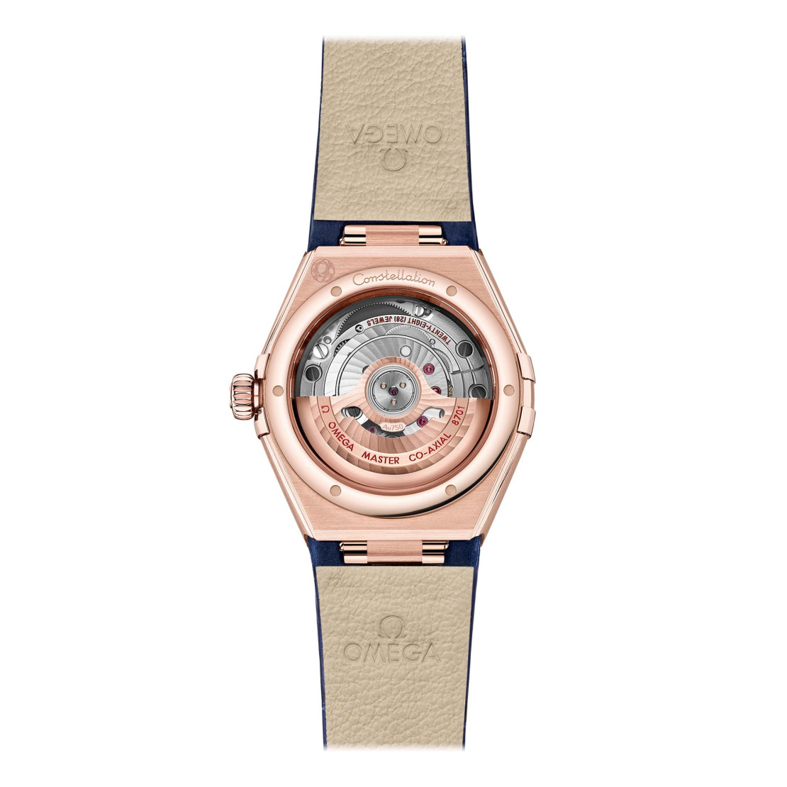 Ref. 131.53.29.20.99.001 - Das spektakuläre und langlebige Design der OMEGA Constellation zeichnet sich durch die berühmten Halbmondfacetten und die „Krappen“ am Gehäuse aus. Die Standard-Eigenschaften dieses 29-mm-Modells sind das Zifferblatt aus natürlichem blauem Aventurin und das schimmernde Lederarmband in passender Farbe. Die aus 18 K Sedna™-Gold gefertigte Uhr besitzt eine mit römischen Ziffern gravierte Lünette und ein Datumsfenster bei 6 Uhr. Die Zeiger, die Stundenindizes, das OMEGA Logo und der Constellation-Stern bestehen aus 18 K Sedna™-Gold. Das Herzstück dieses Zeitmessers bildet das OMEGA Co-Axial Master Chronometer-Kaliber 8701, das durch das gewölbte kratzresistente Saphirglas bewundert werden kann.