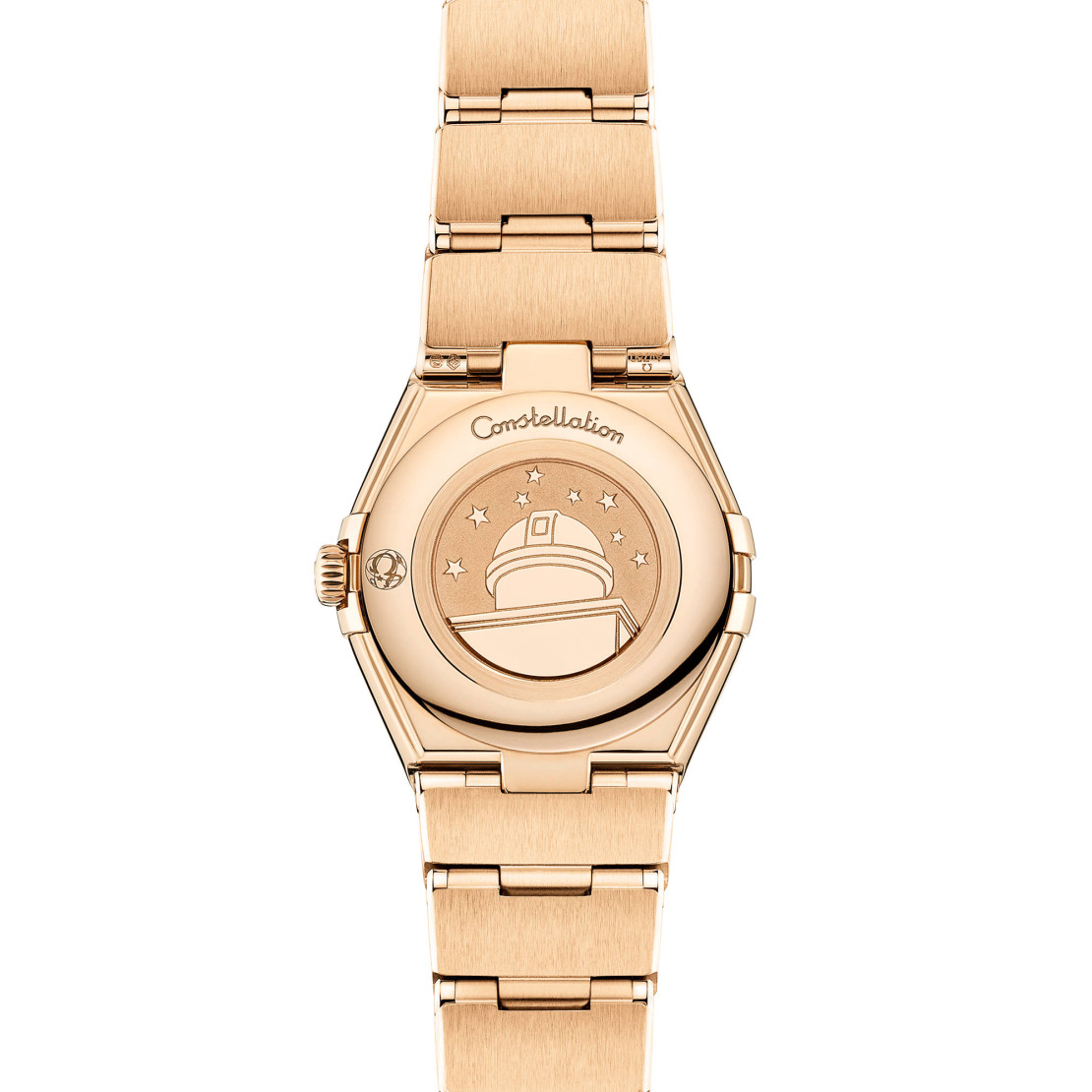 Die Zeiger, das OMEGA Logo, der Constellation-Stern und die Diamantfassungen sind ebenfalls aus 118 K Moonshine™-Gold.