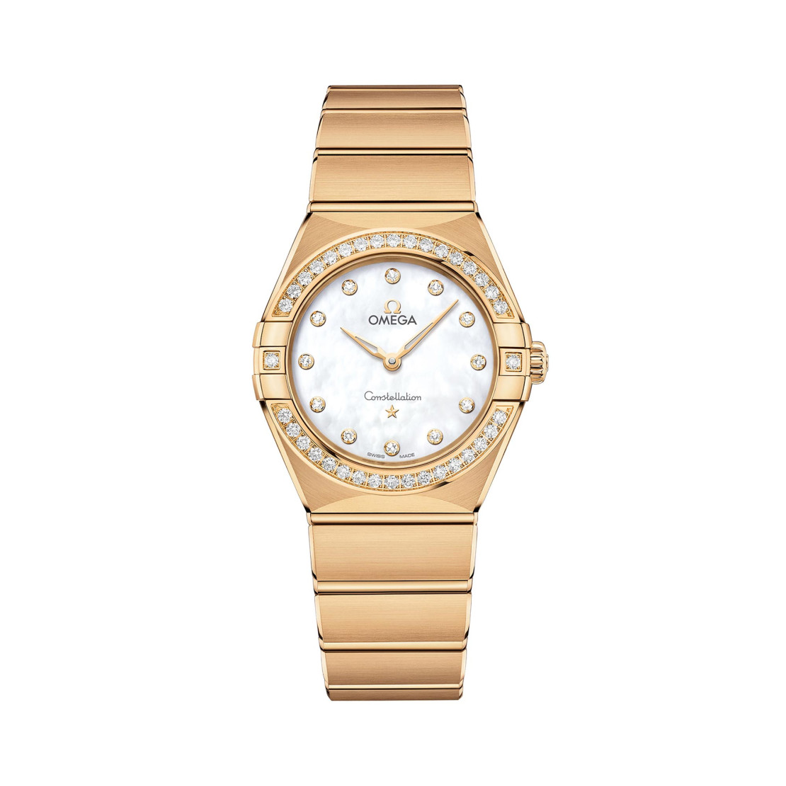 Zeiger, OMEGA Logo, Constellation-Stern und Diamantfassungen aus 18 Gelbgold