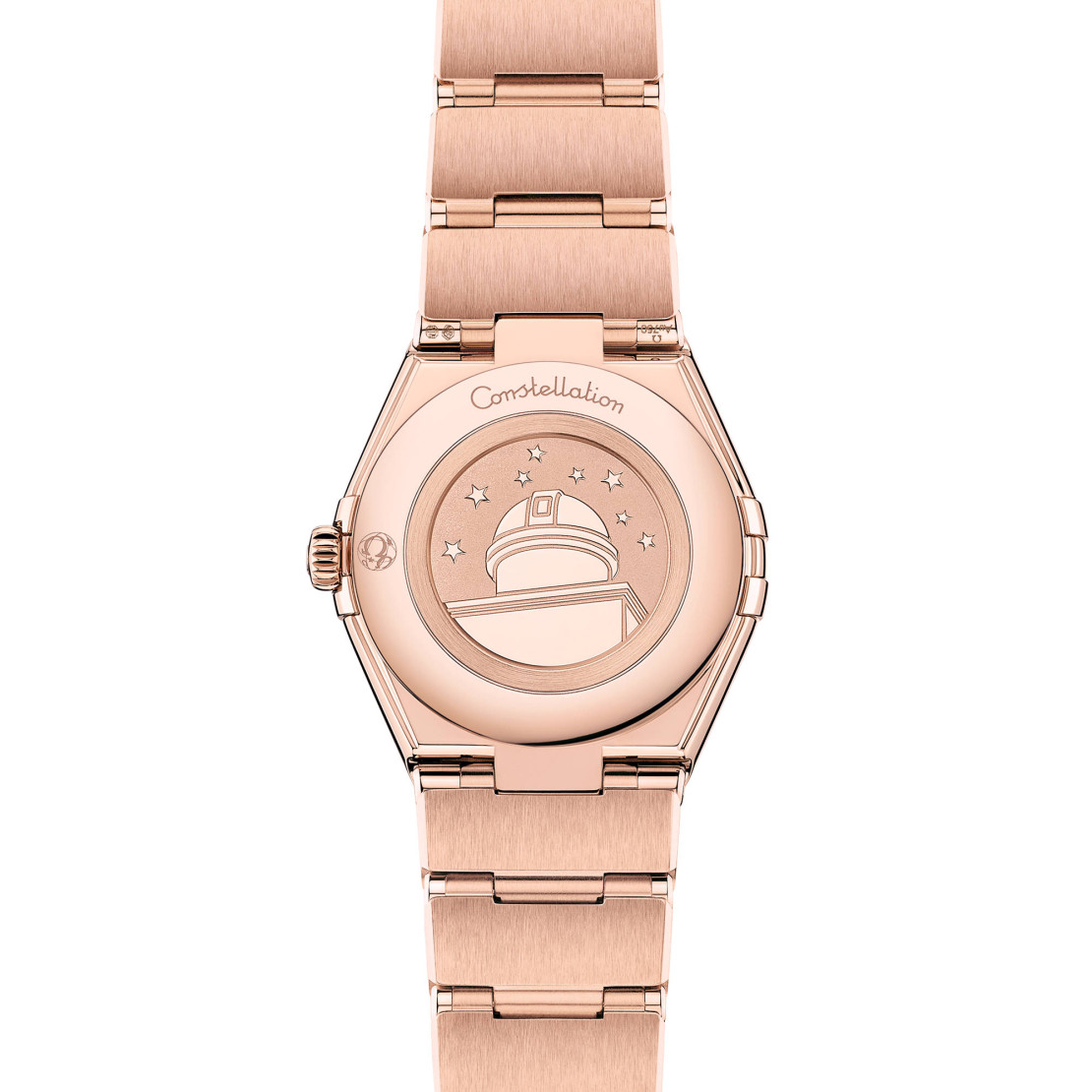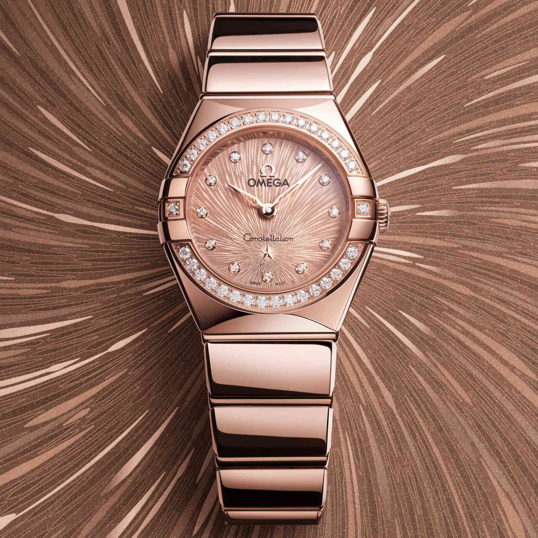 Die Zeiger, das OMEGA Logo, der Constellation-Stern und die Diamantfassungen sind ebenfalls aus 18 K Sedna™-Gold.
