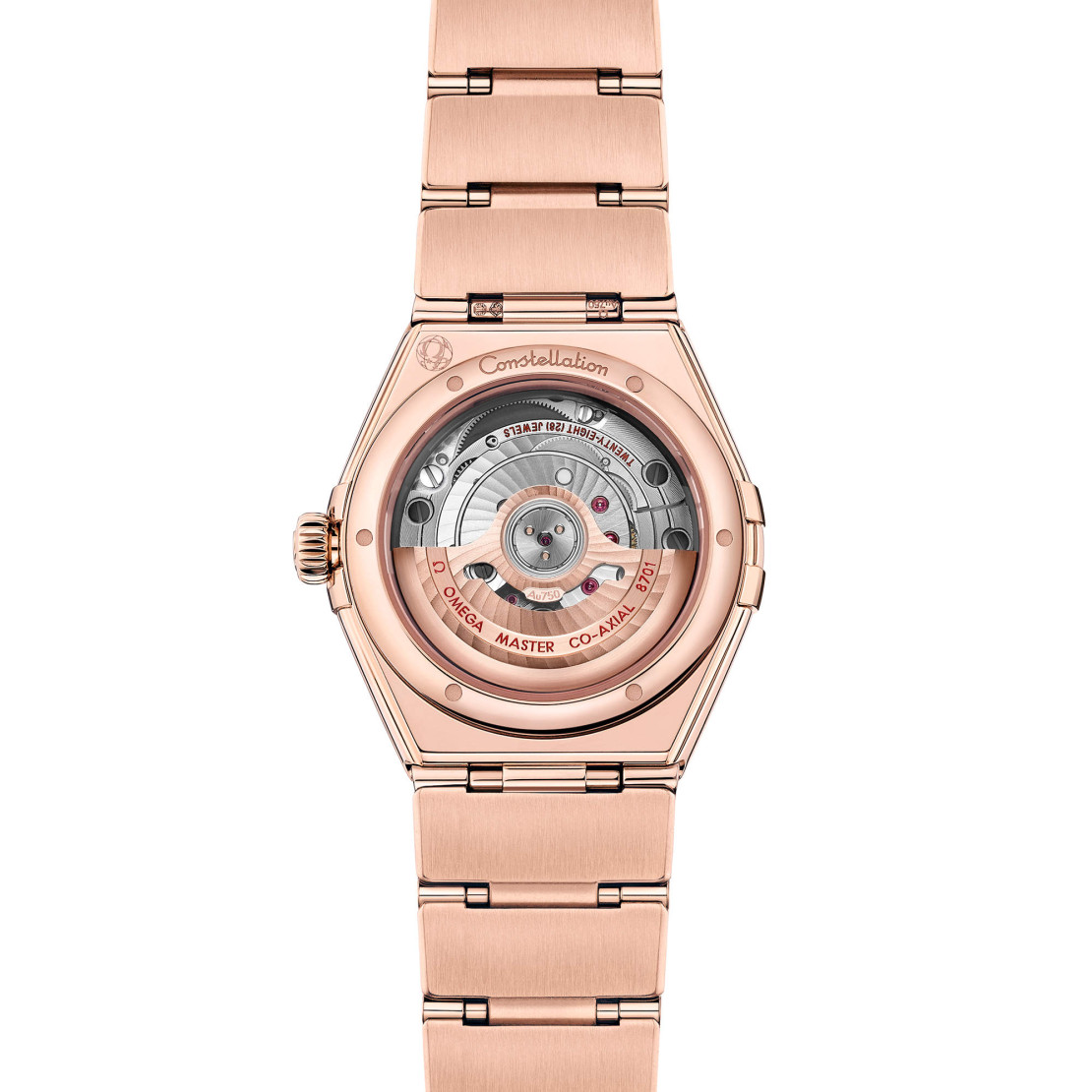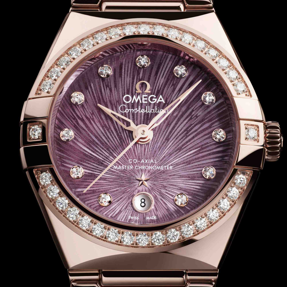 Die Zeiger, das OMEGA Logo, der Constellation-Stern und die Diamantfassungen sind ebenfalls aus 18 K Sedna™-Gold