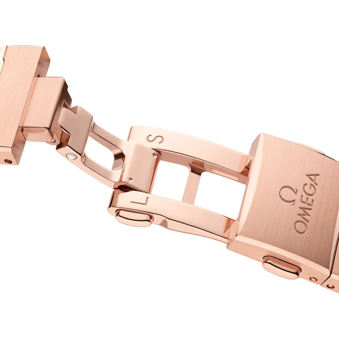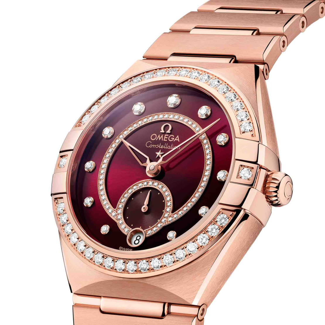 Ref. 131.55.34.20.61.001 - Das spektakuläre und langlebige Design der OMEGA Constellation zeichnet sich durch die berühmten Halbmondfacetten sowie die „Krappen“ an der Gehäuseseite aus. - Dieses 34 mm große Modell aus 18 K Sedna™-Gold verfügt über eine mit Diamanten besetzte Lünette, ein burgunderrotes Zifferblatt mit Sonnenschliff und ein rundes Datumsfenster bei 6 Uhr. Die zulaufenden Diamantstundenindizes verfügen über Fassungen aus 18 K Sedna™-Gold. Die Ringe rund um das Hilfszifferblatt für die kleine Sekunde und den zentralen Minutenring bestehen ebenfalls aus 18 K Sedna™-Gold und sind mit Diamanten besetzt. - Der Zeitmesser wird von dem ikonischen Mono-Rang-Armband mit Doppelfaltschließe und komfortablem Anpassungssystem am Handgelenk gehalten und von dem OMEGA Co-Axial Master Chronometer Kaliber 8803 angetrieben, das durch das gewölbte, kratzresistente Saphirglas sichtbar ist.