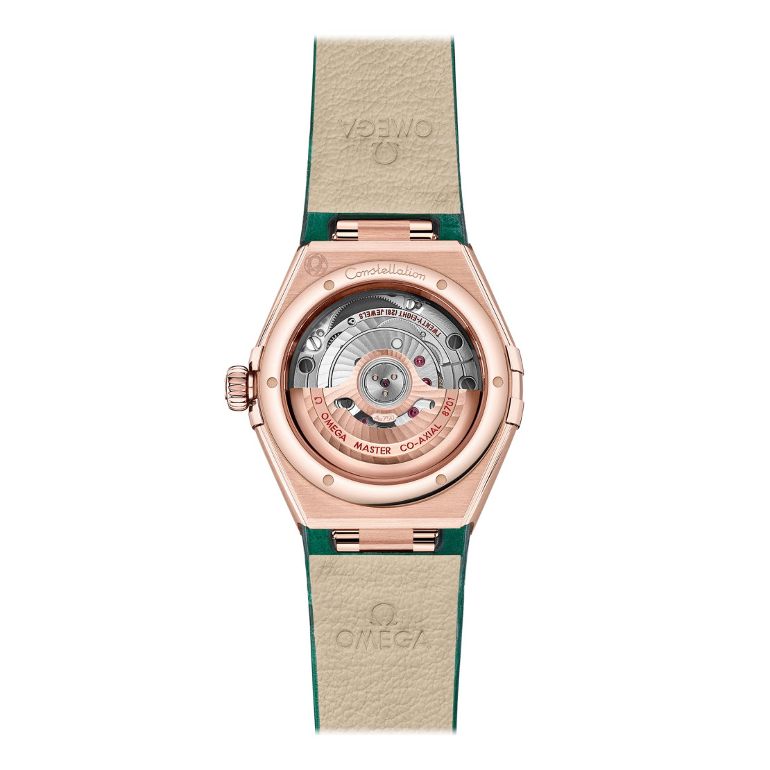 Ref. 131.58.29.20.99.004 - Das spektakuläre und langlebige Design der OMEGA Constellation zeichnet sich durch die berühmten Halbmondfacetten und die „Krappen“ am Gehäuse aus. Die Standard-Eigenschaften dieses 29-mm-Modells sind das Zifferblatt aus natürlichem grünem Aventurin und das schimmernde Lederarmband in passender Farbe. Die aus 18 K Sedna™-Gold gefertigte Uhr besitzt eine diamantbesetzte Lünette und ein Datumsfenster bei 6 Uhr. Die Zeiger, die Stundenindizes, das OMEGA Logo und der Constellation-Stern bestehen aus 18 K Sedna™-Gold. Das Herzstück dieses Zeitmessers bildet das OMEGA Co-Axial Master Chronometer-Kaliber 8701, das durch das gewölbte kratzresistente Saphirglas bewundert werden kann.