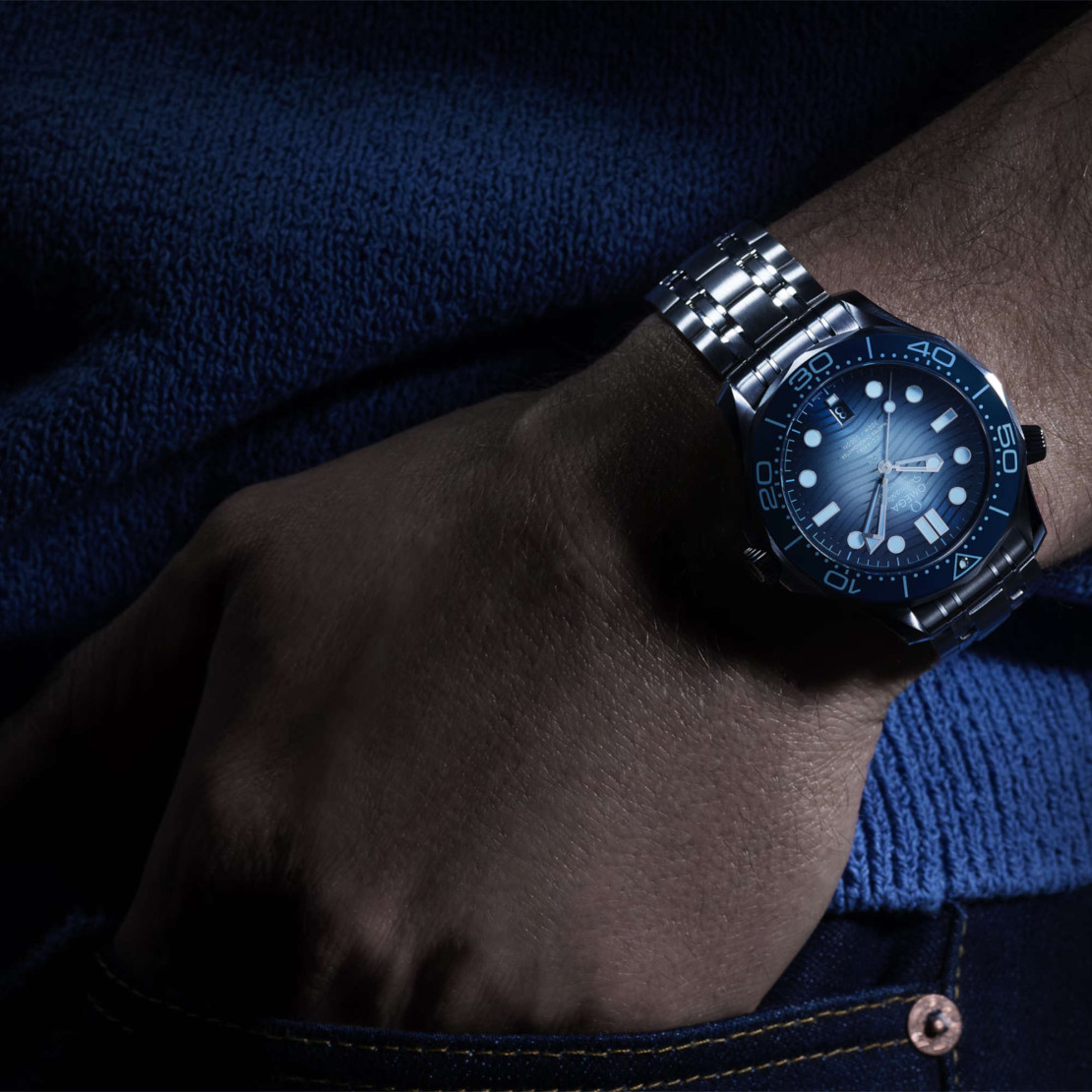Ref. 210.30.42.20.03.003 - Diese Seamaster Diver 300M in 42 mm hat ein Gehäuse und Armband aus Edelstahl. Das Zifferblatt aus Keramik in OMEGAs eigenem Summer Blue verfügt über eine PVD-Beschichtung und einen Farbverlauf, der die Wasserdichtigkeit der Uhr symbolisiert. Es besticht ferner durch das berühmte Wellenmuster der 300M.