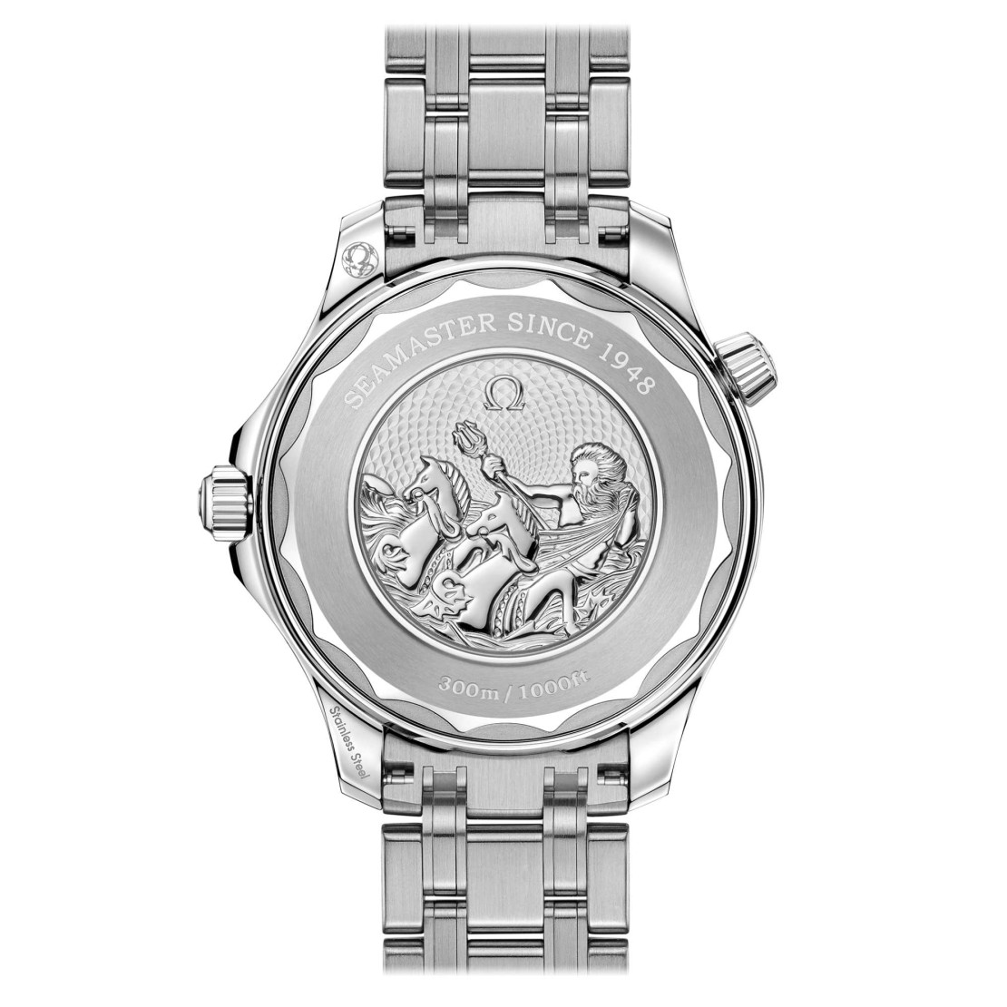 Auf der Rückseite der Uhr ist ein geprägtes Seamaster Gedenklogo zu sehen, das einen Poseidon mit Dreizack und zwei Seepferdchen zeigt: OMEGAs ursprüngliches Design von 1956 und aktuelles Markenemblem. Dahinter befindet sich OMEGAs Co-Axial Master Chronometer Kaliber 8800, das vom Eidgenössischen Institut für Metrologie (METAS) gemäß den höchsten Normen der Branche zertifiziert wurde.