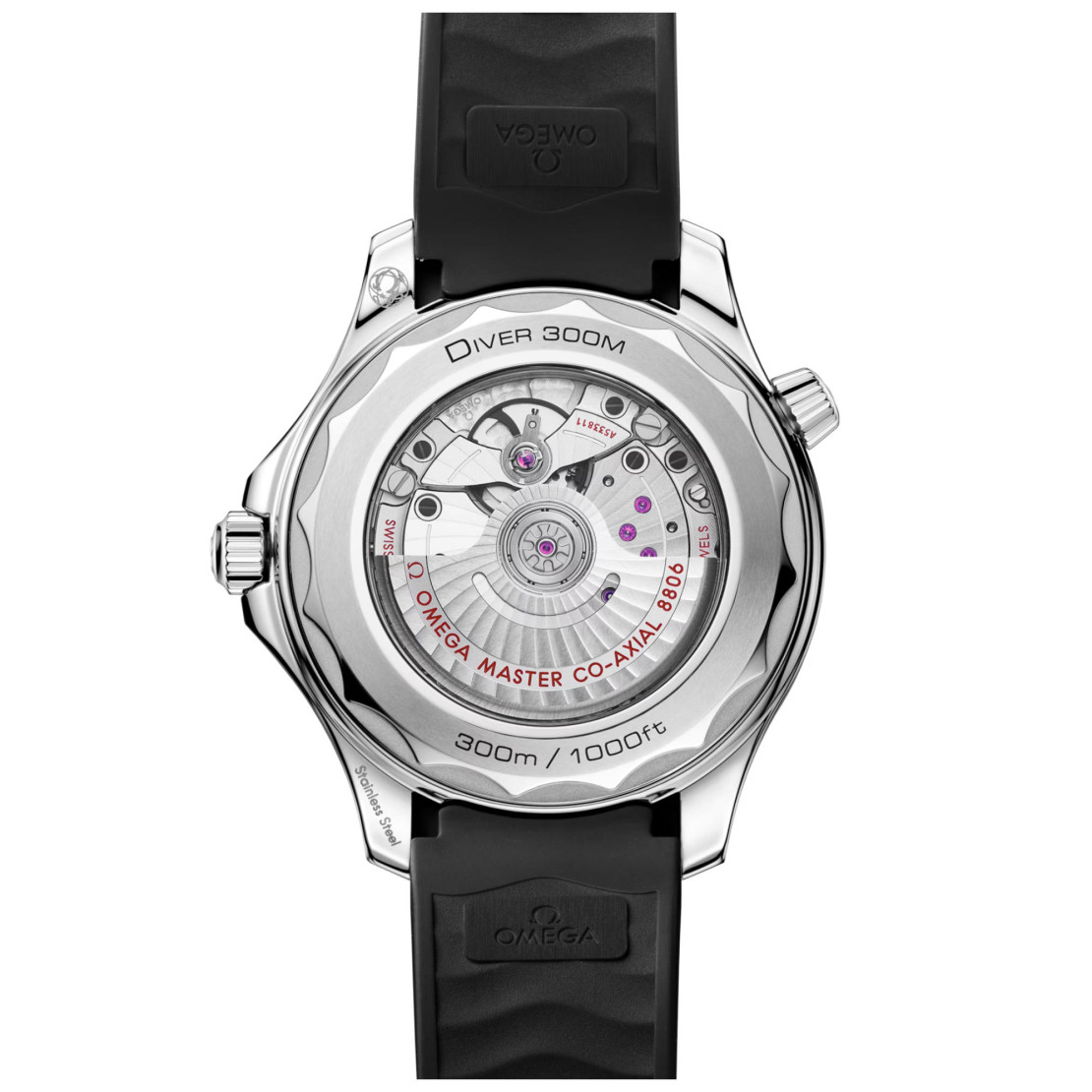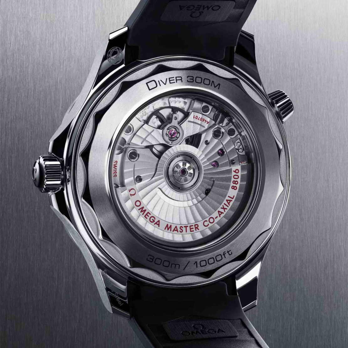 Am Handgelenk gehalten wird die Uhr von einem integrierten schwarzen Kautschukarmband mit Faltschließe, für den Antrieb sorgt das OMEGA Co-Axial Master Chronometer Kaliber 8806, das durch den Saphirglasboden bewundert werden kann.
