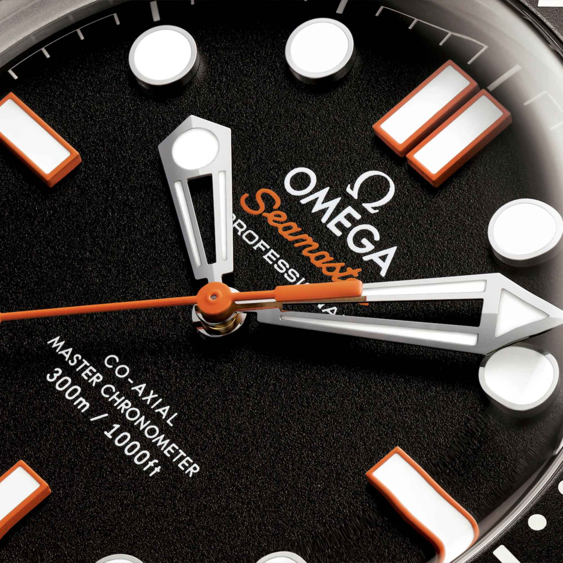 Schwarzes Aluminium wurde auch für das Zifferblatt verwendet, dessen rhodinierte, skelettierte Zeiger und Indizes ebenfalls mit weißer Super-LumiNova gefüllt sind. Für den zentralen Sekundenzeiger, die vier Viertelstundenindizes und den Namen Seamaster fiel die Wahl auf die Farbe Orange, das OMEGA Logo wurde in Weiß aufgedruckt.
