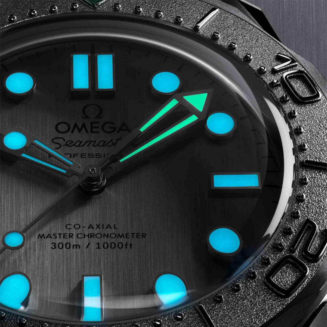 Für das gebürstete Zifferblatt sowie die polierten, skelettierten und mit weißer Super-LumiNova gefüllten Zeiger und Indizes wurde eine PVD-Beschichtung aus Edelstahl verwendet. Die anderen Markierungen, darunter das OMEGA Logo, wurden in Schwarz aufgedruckt.