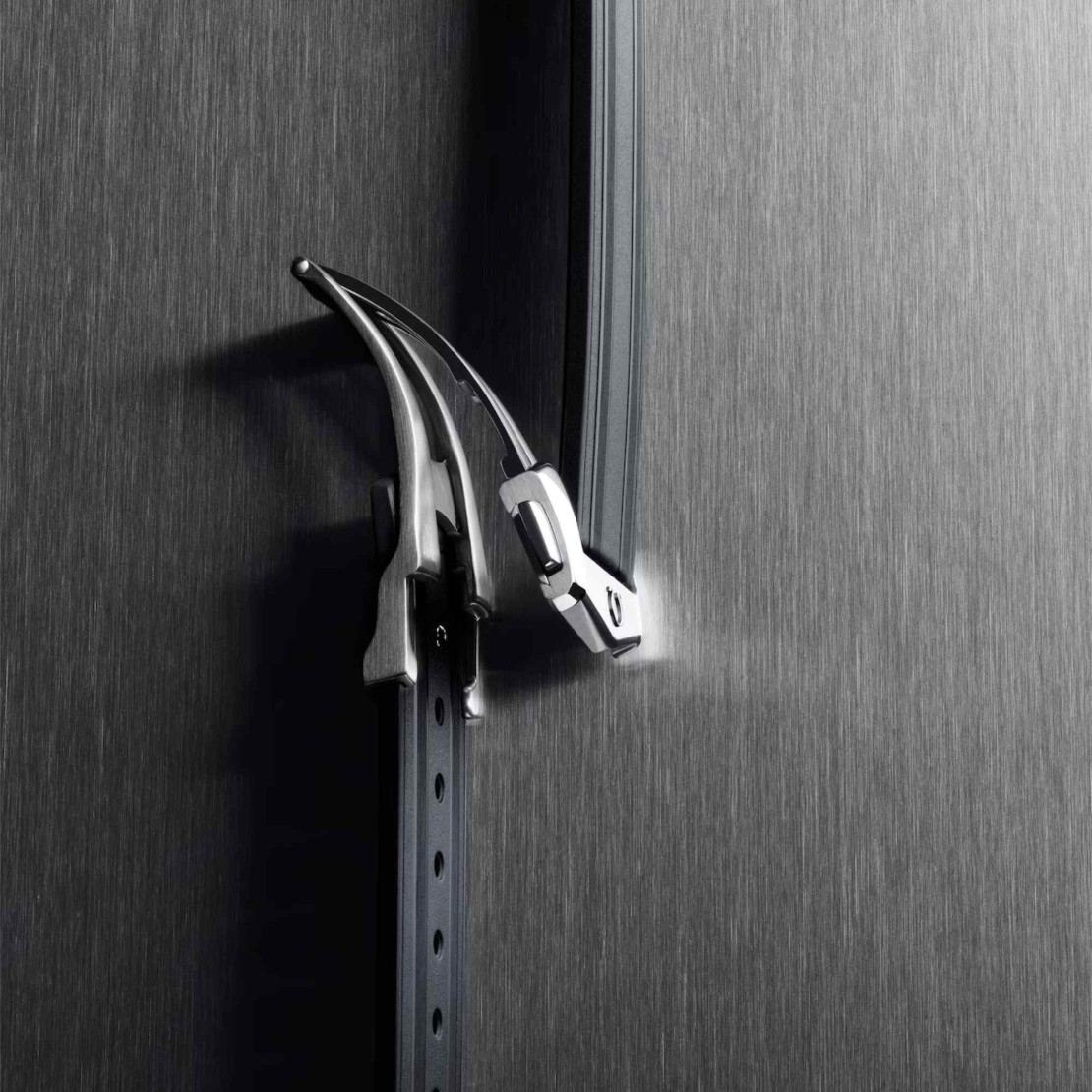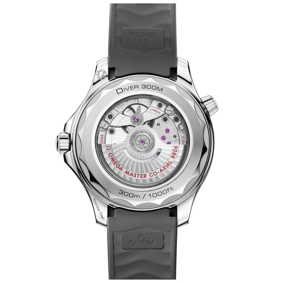 Am Handgelenk gehalten wird die Uhr von einem integrierten grauen Kautschukarmband mit Faltschließe, für den Antrieb sorgt das OMEGA Co-Axial Master Chronometer Kaliber 8806, das durch den Saphirglasboden bewundert werden kann.