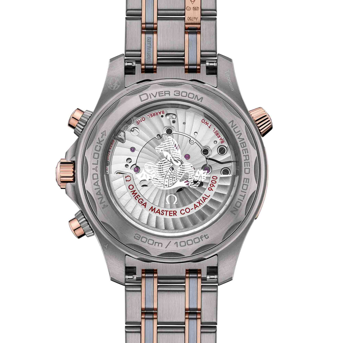 Ref. 210.60.44.51.03.001 - Seit 1993 hat die Seamaster Professional Diver 300M eine begeisterte Anhängerschaft. Bei diesem 44-mm-Chronographen handelt es sich um eine auf nummerierte Auflage aus Titan Grade 2, 18 K Sedna™-Gold und Tantal, das an der Lünettenbasis und in den Mittelgliedern des Armbands zu finden ist. - Die Lünette aus 18 K Sedna™-Gold ist mit einer lasergravierten Tauchskala versehen, während das polierte blaue Keramikzifferblatt [ZrO2] mit lasergravierten Wellen, einem Datumsfenster bei 6 Uhr und Hilfszifferblattringen mit Akzenten aus 18 K Sedna™-Gold besticht. - Auf der Seite des Gehäuses findet sich eine Plakette aus 18 K Sedna™-Gold, auf der die Seriennummer der nummerierten Auflage eingraviert wurde. Auf der Rückseite der Uhr offenbart sich das OMEGA-Seepferdchen, das per Lasergravur und Lackierung auf dem Saphirglas verewigt wurde. Durch das Glas kann das OMEGA Co-Axial Master Chronometer Kaliber 9900 bewundert werden, das von dem Schweizerischen Eidgenössischen Institut für Metrologie (METAS) zertifiziert wurde.