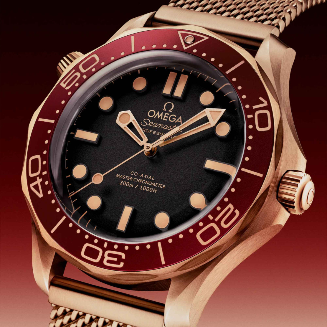 Das 42-mm-Gehäuse aus OMEGAs exklusivem Bronze-Gold verfügt über einen burgunderroten, mit Oxalsäure eloxierten Lünettenring aus Aluminium, der eine Tauchskala aus Vintage-Super-LumiNova aufweist.