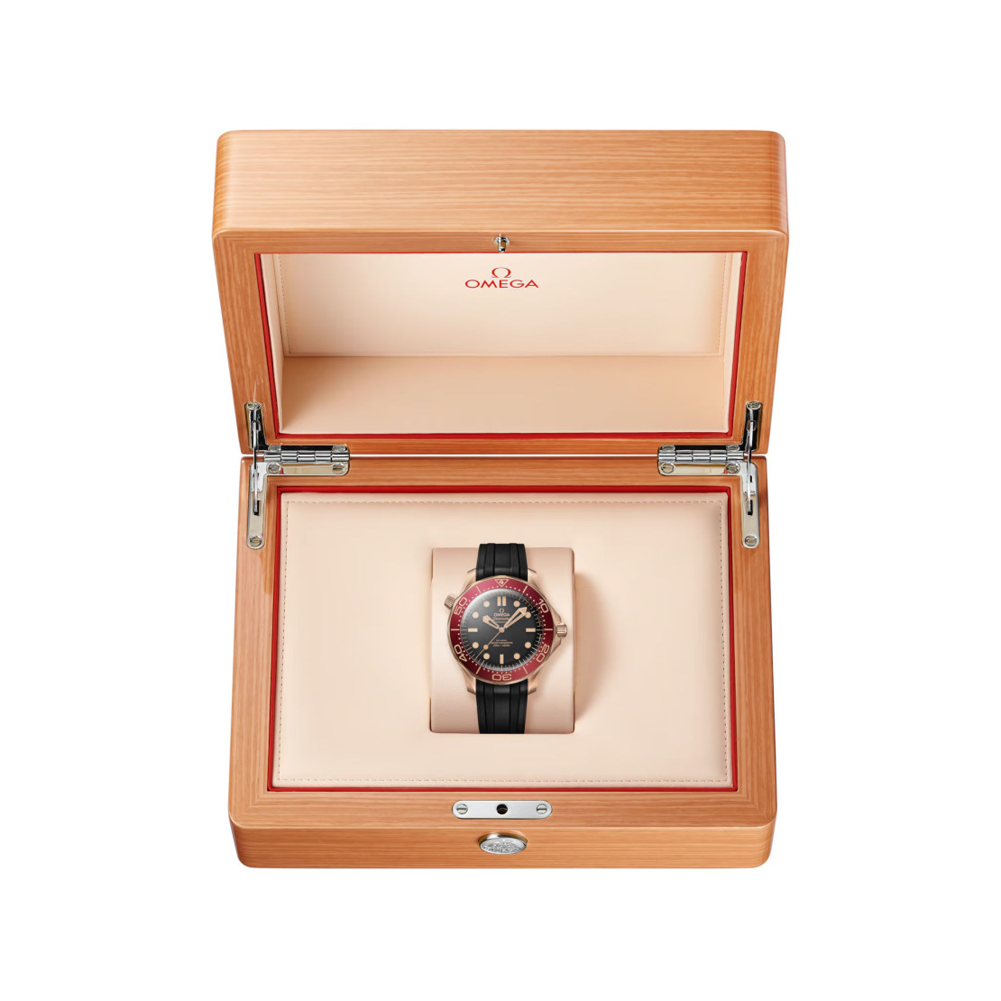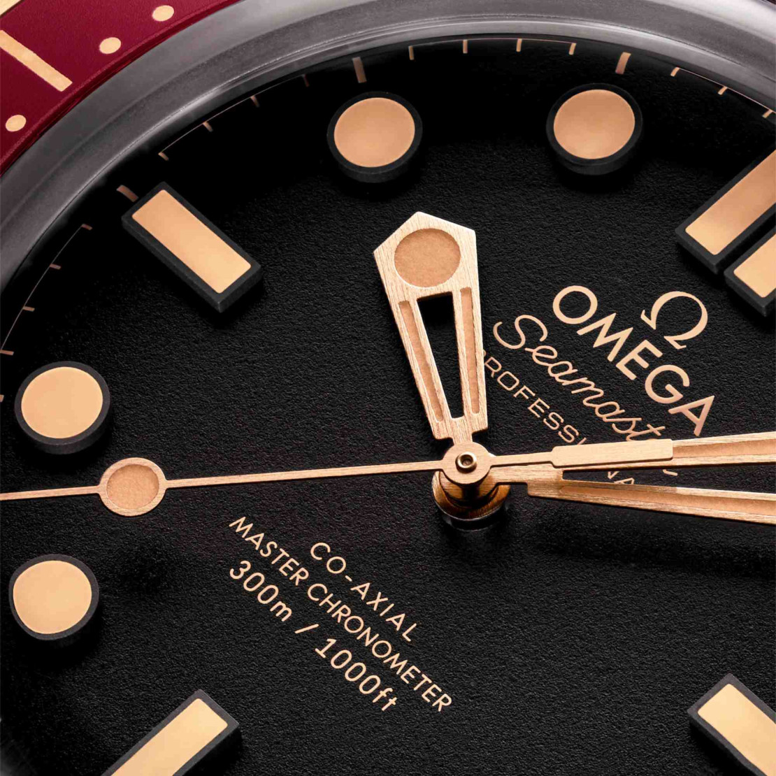 Das 42-mm-Gehäuse aus OMEGAs exklusivem Bronze-Gold verfügt über einen burgunderroten, mit Oxalsäure eloxierten Lünettenring aus Aluminium, der eine Tauchskala aus Vintage-Super-LumiNova aufweist.