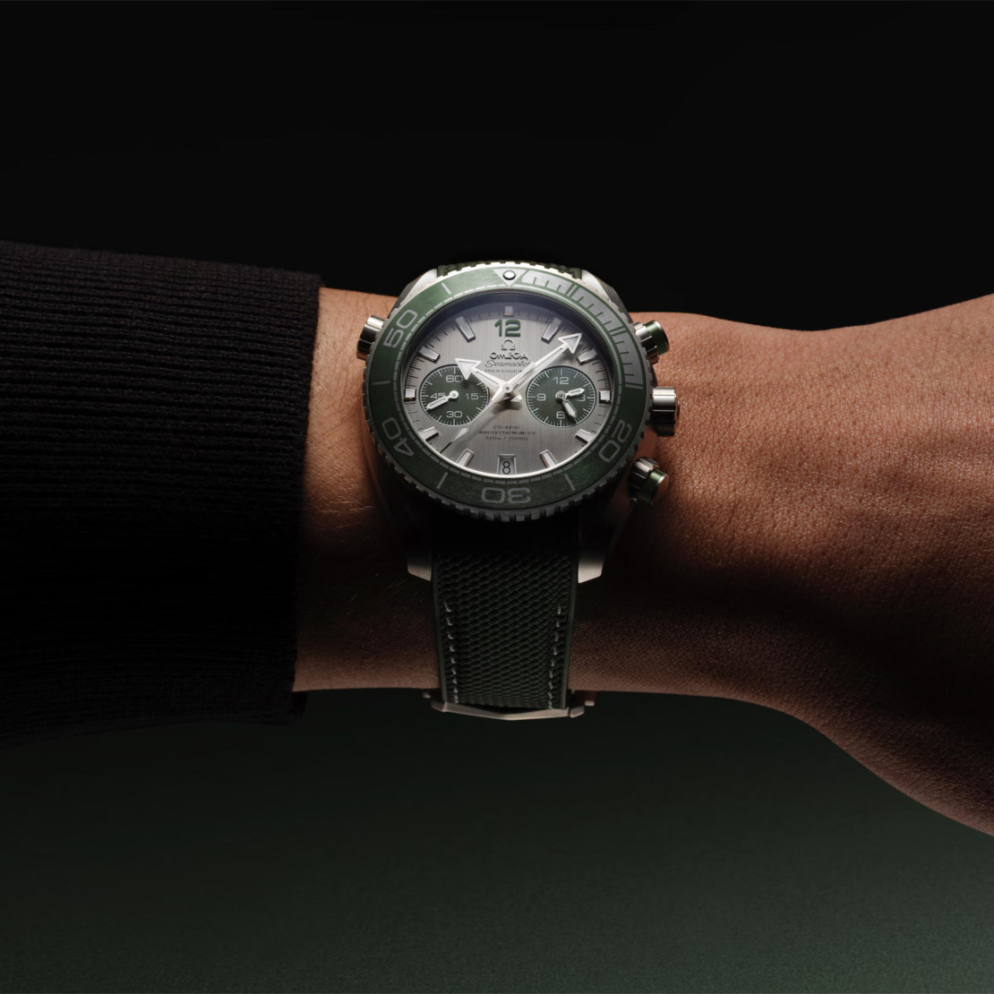 Dieser Chronograph besticht durch ein 45,50 mm großes Gehäuse aus gebürstetem Edelstahl und Drücker mit Ringen aus gebürsteter grüner Keramik. Außerdem gibt es einen gebürsteten grünen Keramikring mit einer Taucherskala aus Liquidmetal™.