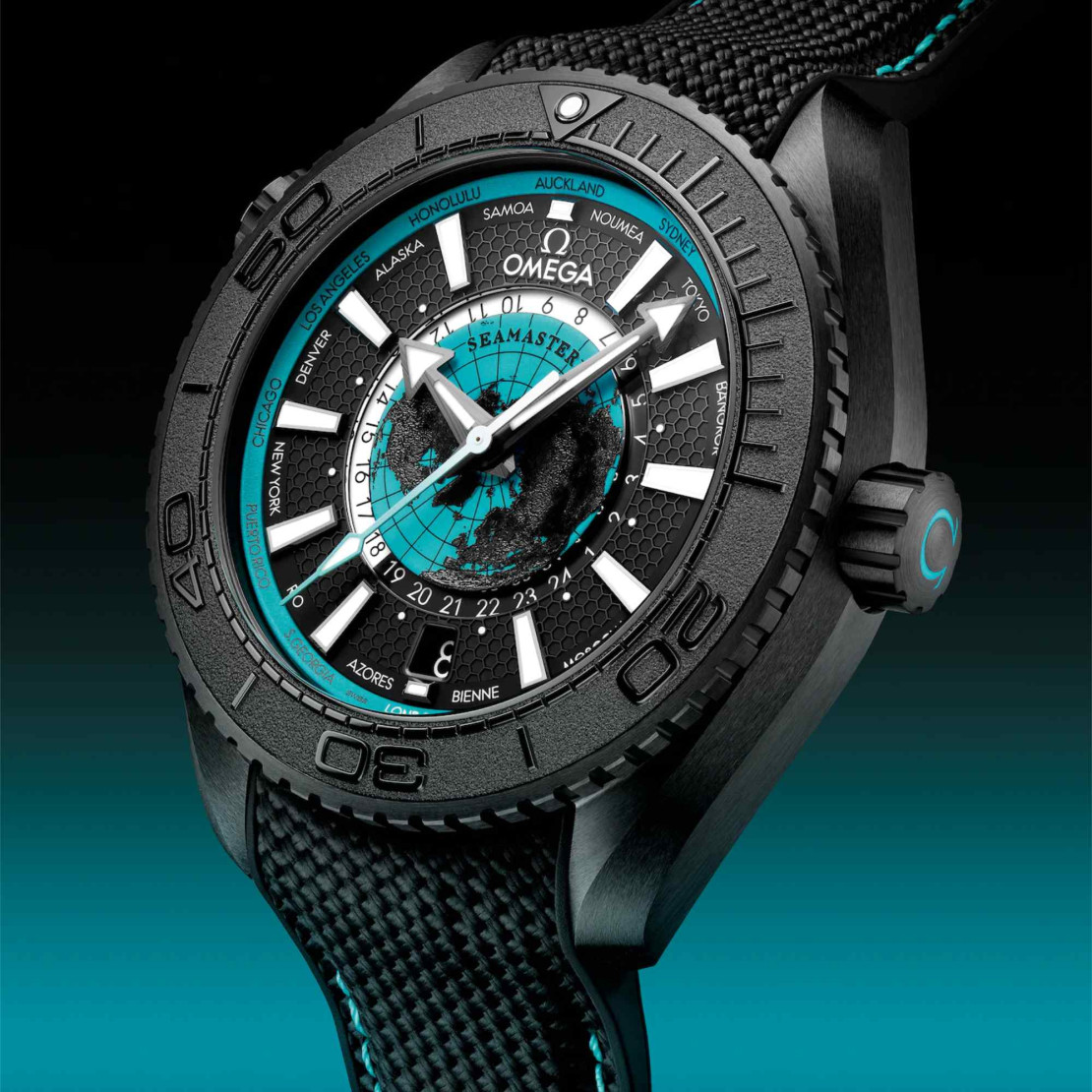Diese Worldtimer wird an einem integrierten Armband aus schwarzem strukturiertem Kautschuk mit türkisfarbenen Nähten getragen, das über eine Faltschließe aus Keramik und keramisiertem Titan verfügt. Angetrieben wird die Uhr vom OMEGA Co-Axial Master Chronometer Kaliber 8938, das durch den Saphirglasboden sichtbar ist.