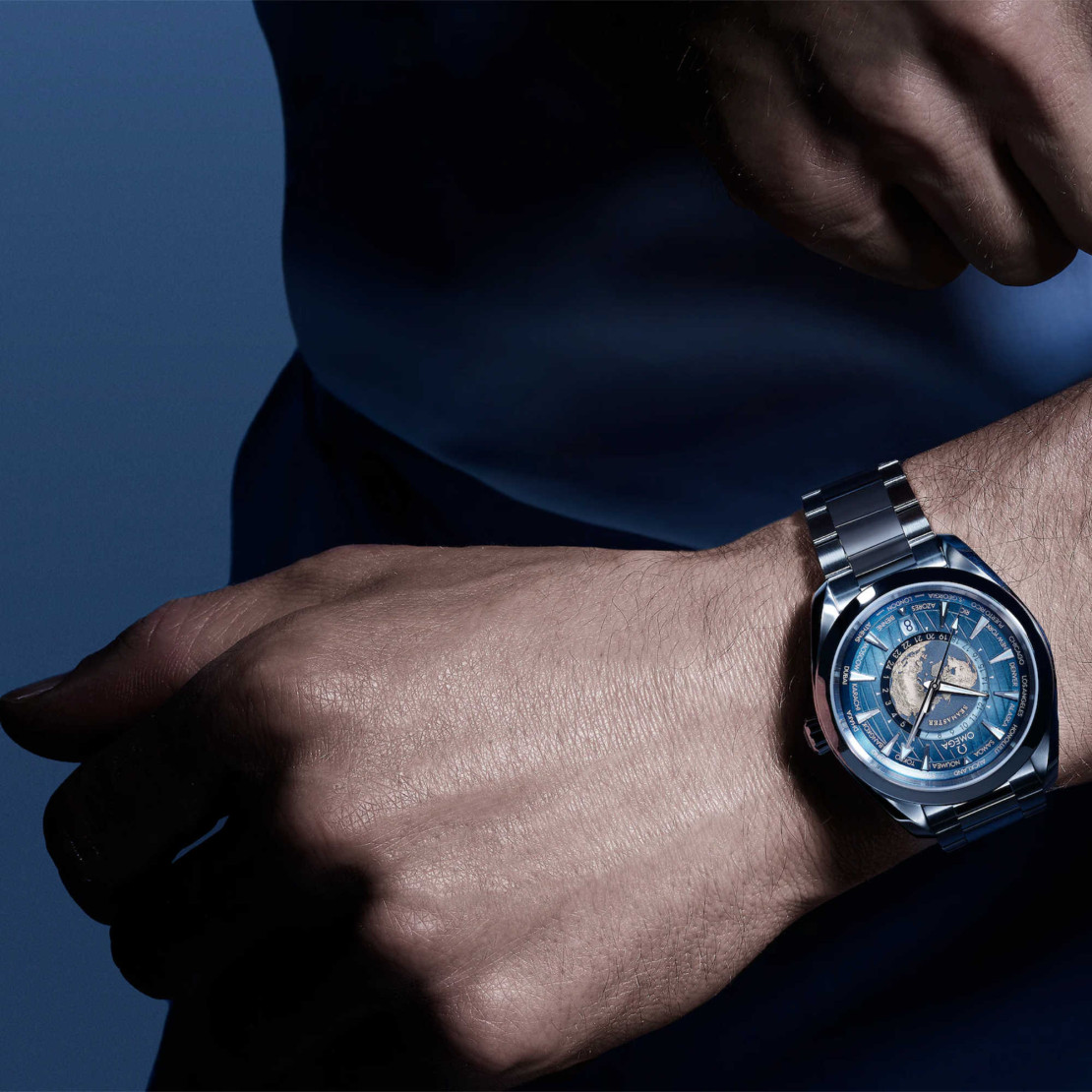 Das Zifferblatt mit Sonnenschliff in OMEGAs eigenem Summer Blue verfügt über einen Farbverlauf, der die Wasserdichtigkeit der Uhr symbolisiert. Die vertikalen „Teak“-Streifen sowie rhodinierten Zeiger und Indizes sind mit einer einzigartigen hellblauen Super-LumiNova gefüllt.
