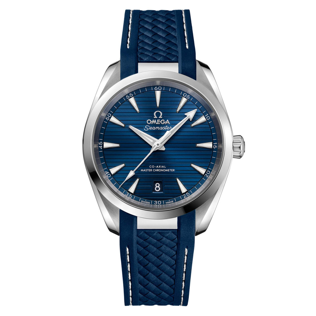 Ref. 220.12.38.20.03.001 - Die Seamaster Aqua Terra ist ein Tribut an OMEGAs großes maritimes Erbe. Das symmetrische Gehäuse dieses 38-mm-Modells besteht aus Edelstahl und ist auf der Rückseite mit einem Wellendekor versehen. - Das blaue Zifferblatt mit Sonnenschliff zeichnet sich durch ein horizontales „Teak“-Dekor aus, das sich an den hölzernen Deckplanken von Luxus-Segeljachten inspiriert. Das Zifferblatt verfügt außerdem über ein Datumsfenster bei 6 Uhr und die rhodinierten Zeiger und Indizes sind mit weißer Super-LumiNova gefüllt. - Das blaue Armband aus strukturiertem Kautschuk ist mit einer grauen Unterfütterung sowie einem Glied aus Edelstahl versehen, das es mit dem Gehäuse verbindet. Der Zeitmesser wird von dem OMEGA Master Chronometer Kaliber 8800 angetrieben, das vom Eidgenössischen Institut für Metrologie (METAS) zertifiziert wurde und höchsten Branchenstandards entspricht.