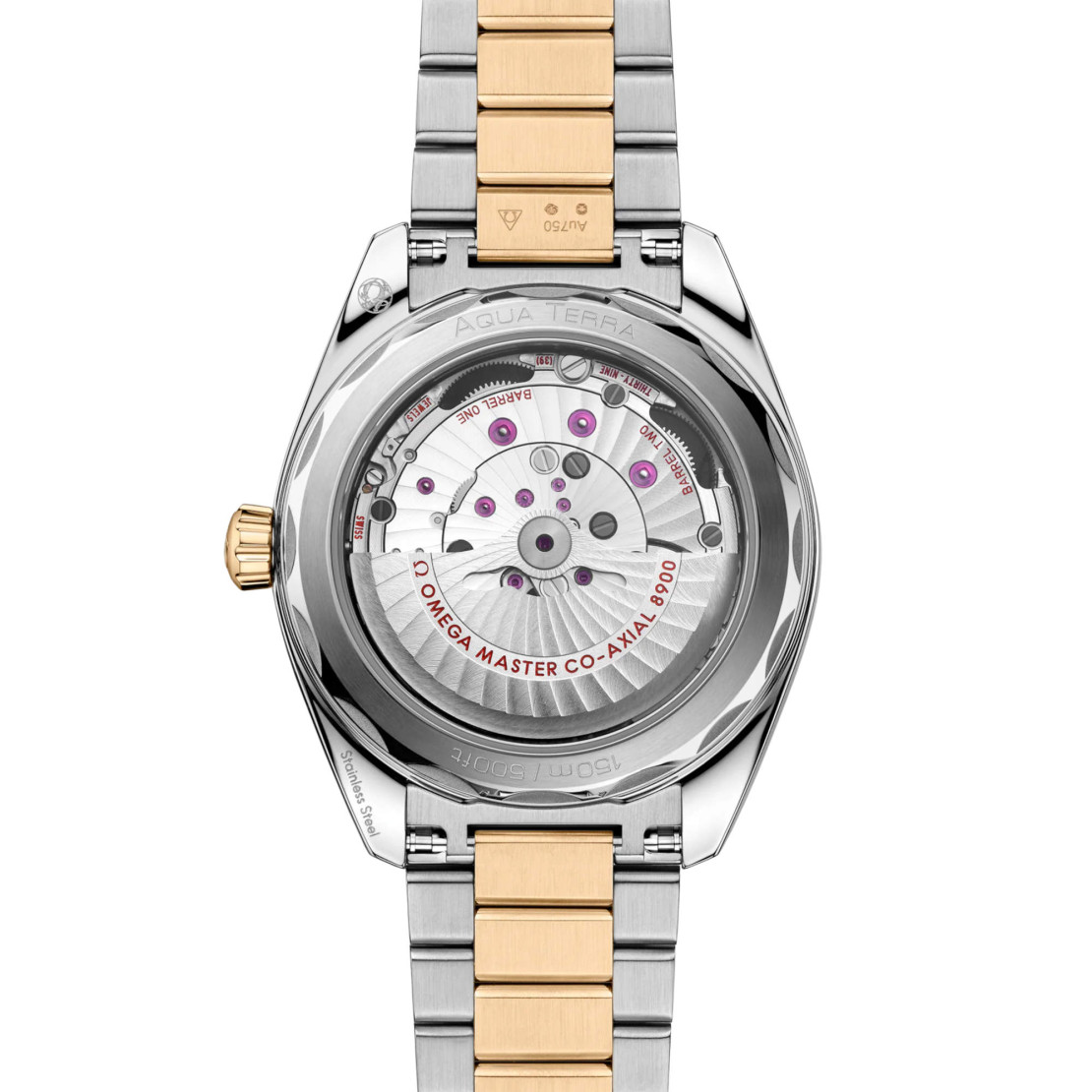 Ref. 220.20.41.21.01.001 - Die Seamaster Aqua Terra ist eine Hommage an OMEGAs großes maritimes Erbe. Dieses 41-mm-Modell besitzt ein symmetrisches Gehäuse aus Edelstahl und 18 K Moonshine™-Gold, dessen verschraubter Gehäuseboden mit einem Wellendesign versehen ist.