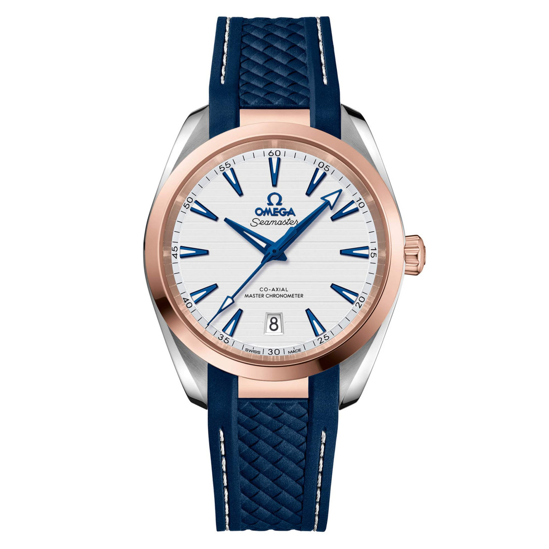 Blaues Armband aus strukturiertem Kautschuk mit einer grauen Unterfütterung sowie einem Glied aus 18 K Sedna™-Gold