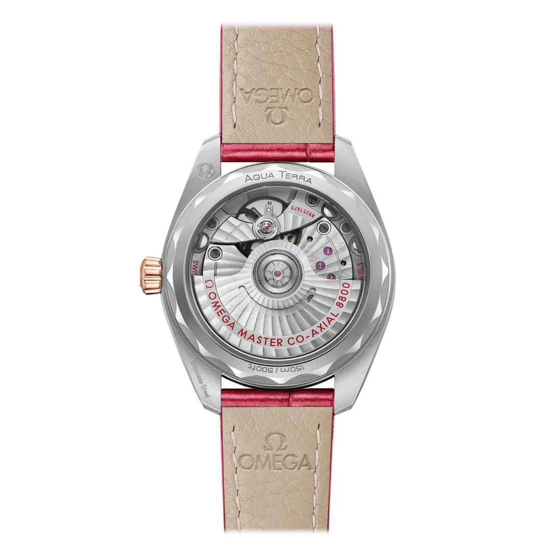 Ref. 220.23.34.20.60.001 - Mit Stundenindizes aus Edelsteinen ist diese Seamaster Aqua Terra für Damen der Inbegriff der Eleganz. Die schöne OMEGA Seamaster mit 34 mm Durchmesser besitzt ein symmetrisches Gehäuse aus Edelstahl und 18 K Sedna™-Gold sowie eine polierte Lünette. Das blassrosafarbene Zifferblatt mit Wellendekor ist mit zentralen Zeigern für Stunden, Minuten und Sekunden aus diamantpoliertem 18 K Sedna™-Gold, einem Datumsfenster bei 6 Uhr und 11 Rubinen im Marquiseschliff als Stundenindizes ausgestattet. Die Uhr mit rotem, glänzendem Lederarmband wird von dem OMEGA Co-Axial Master Chronometer Kaliber 8800 angetrieben, das von dem Eidgenössischen Institut für Metrologie (METAS) gemäß den höchsten Branchenstandards zertifiziert wurde.