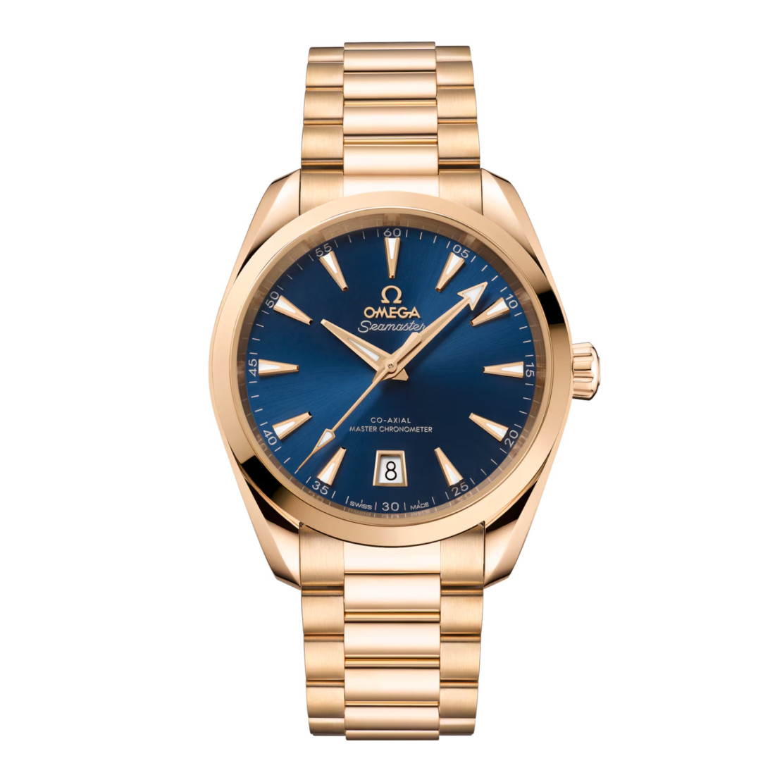 Das Zifferblatt mit Sonnenschliff und blauer PVD-Beschichtung weist ein OMEGA Logo aus 18 K Moonshine™-Gold und ein Datumsfenster bei 6 Uhr auf. Die ebenfalls aus 18 K Moonshine™-Gold gefertigten Zeiger und Stundenindizes sind mit weißer Super-LumiNova gefüllt, die im Dunkeln blau leuchtet.