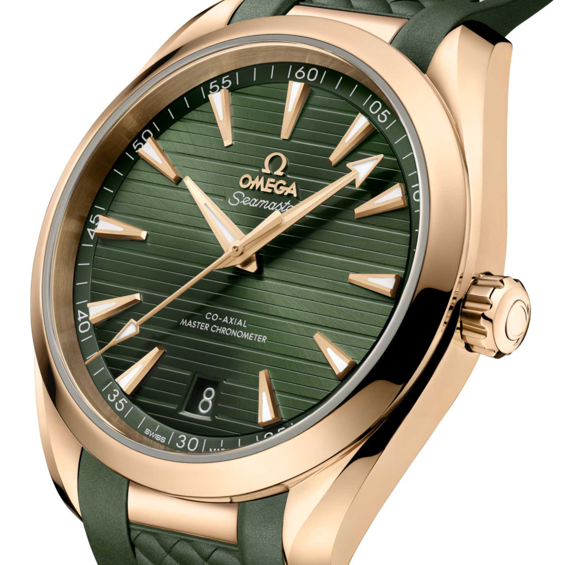 Ref. 220.52.41.21.10.001 - Die Seamaster Aqua Terra ist eine Hommage an OMEGAs grosses maritimes Erbe. Dieses 41-mm-Modell verfügt über ein symmetrisches Gehäuse aus 18 K Moonshine™-Gold mit einem Wellendekor auf dem Gehäuseboden.