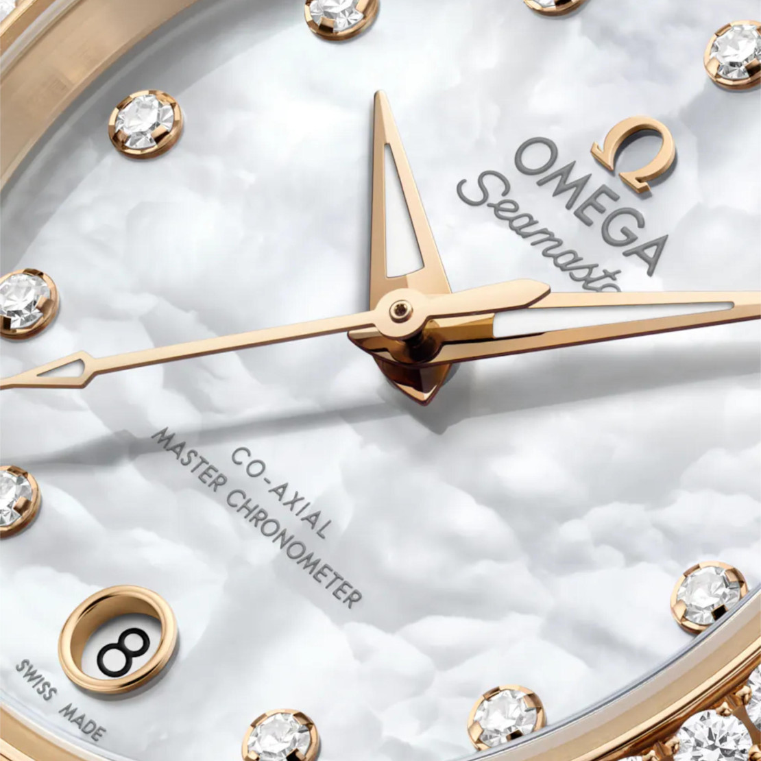 Das perlweiße Perlmuttzifferblatt weist ein glänzendes Finish und ein kreisförmiges Datumsfenster bei 6 Uhr auf. Hervorgehoben wird es von elf Diamantstundenindizes und überarbeiteten, facettierten Zeigern, wobei der Minutenzeiger in einer zarten Spitze endet. Alle applizierten Elemente wurden aus 18 K Moonshine™-Gold gefertigt, während die Zeiger aus 18 K Gelbgold mit PVD-Beschichtung aus Moonshine™-Gold bestehen. Die Zeiger wurden außerdem mit weißer, im Dunkeln blau leuchtender Super-LumiNova gefüllt.