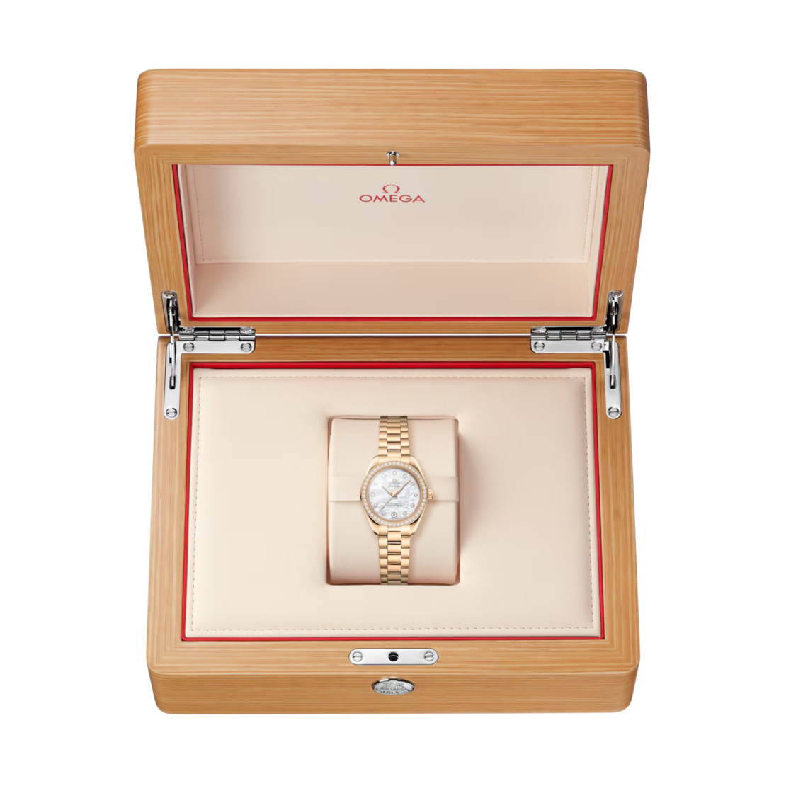 Am Handgelenk gehalten wird die Uhr von einem integrierten Edelstahlarmband mit schön abgerundeten, polierten und gebürsteten Gliedern, einer Doppelfaltschließe und dem einfachen Komfortverschluss von OMEGA.