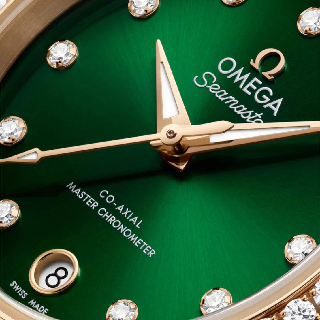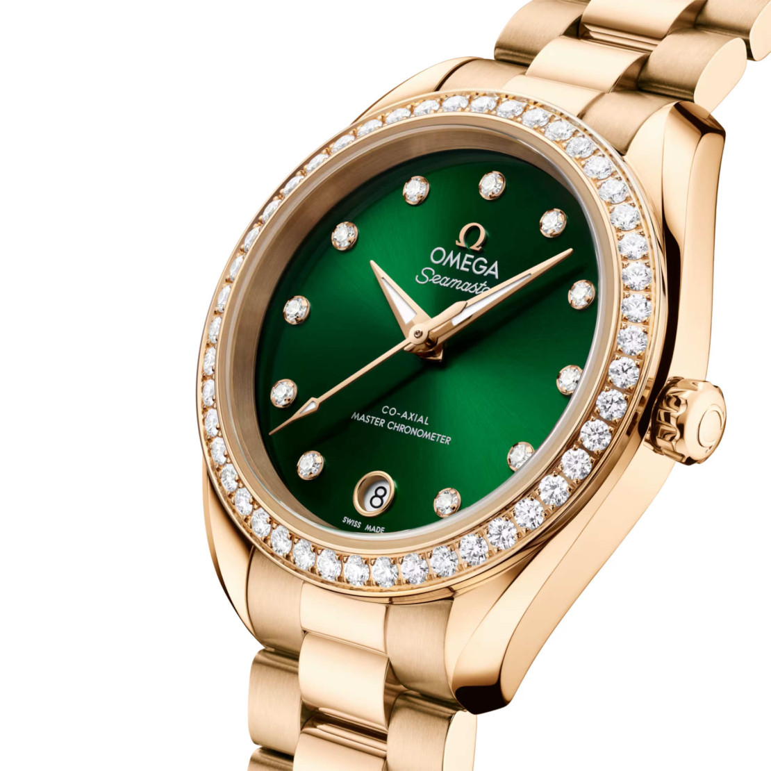 Das grüne Zifferblatt wurde mit einem Sonnenschliff und farbigem Lack versehen und weist ein kreisförmiges Datumsfenster bei 6 Uhr auf. Hervorgehoben wird es von elf Diamantstundenindizes und überarbeiteten, facettierten Zeigern, wobei der Minutenzeiger in einer zarten Spitze endet. Alle applizierten Elemente wurden aus 18 K Moonshine™-Gold gefertigt, während die Zeiger aus 18 K Gelbgold mit PVD-Beschichtung aus Moonshine™-Gold bestehen. Die Zeiger wurden außerdem mit weißer, im Dunkeln blau leuchtender Super-LumiNova gefüllt.