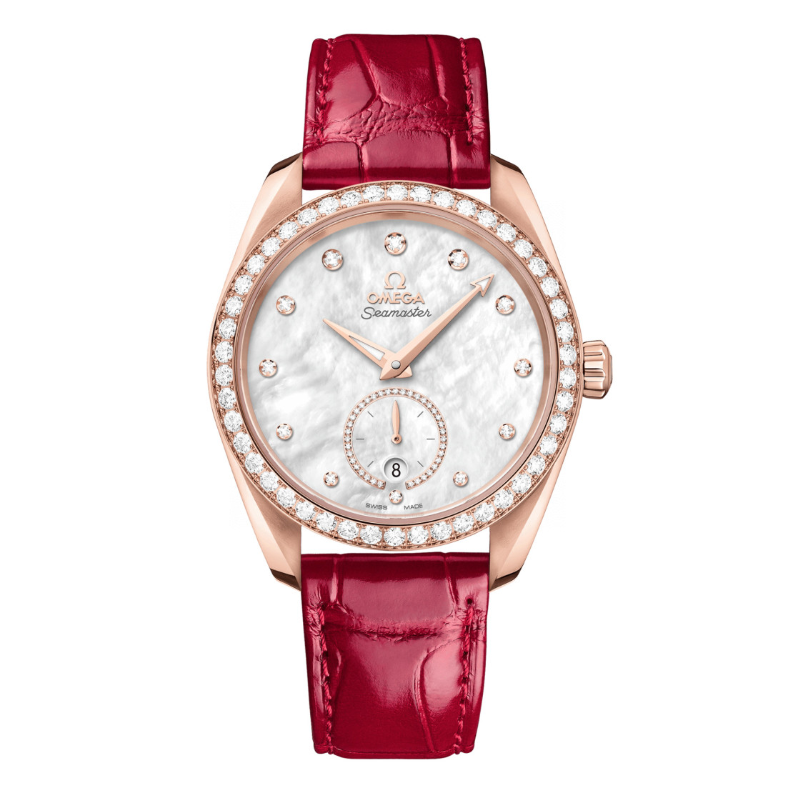 Das strahlend weiße Perlmuttzifferblatt zeichnet sich durch ein Datumsfenster bei 6 Uhr sowie ein Hilfszifferblatt für die kleine Sekunde aus, das von einem diamantbesetzten Ring aus 18 K Sedna™-Gold umrahmt ist. Darüber hinaus wird das Design durch Zeiger aus 18 K Sedna™-Gold ergänzt, die mit weißer Super-LumiNova gefüllt sind, sowie durch zulaufende Diamantindizes in Fassungen aus 18 K Sedna™-Gold.