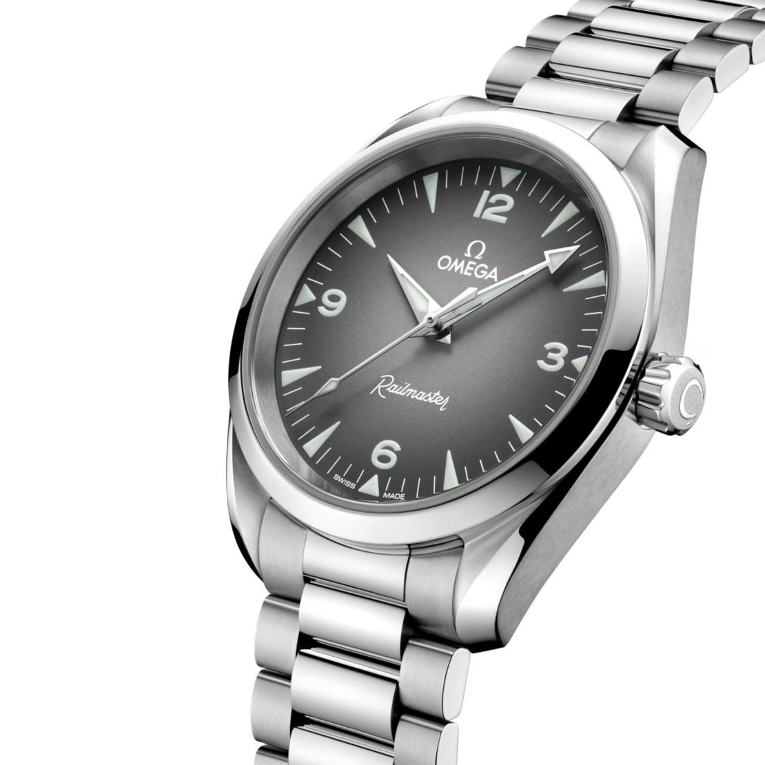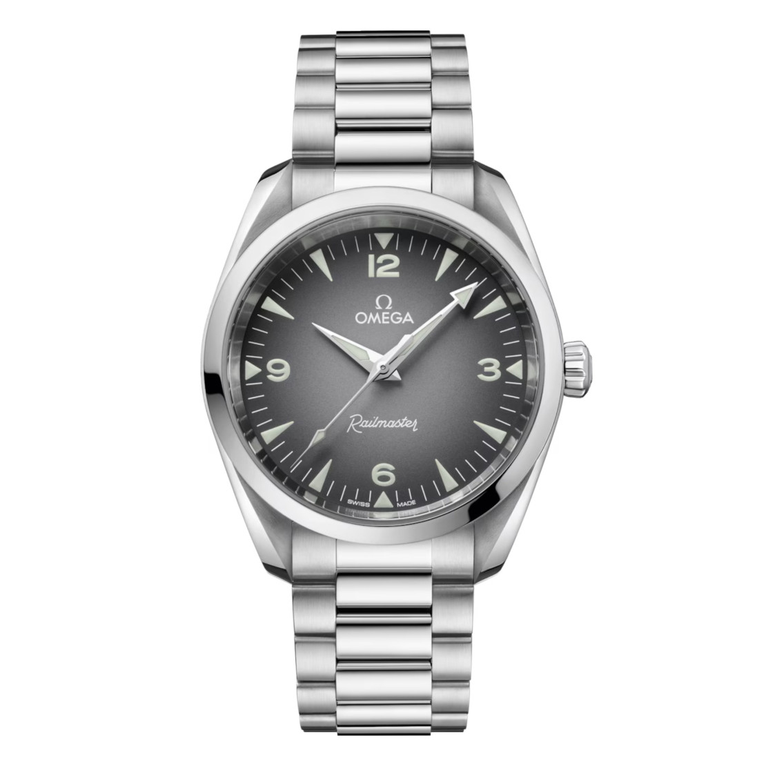 Das symmetrische 38-mm-Gehäuse ist gebürstet und poliert und wird von einem integrierten Armband mit Komfortverschluss sowie gebürsteten und polierten Gliedern am Handgelenk gehalten. In Anlehnung an die gut ablesbare Anzeige der Original Railmaster zeigt sich das Zifferblatt dieses Modells in Grau mit schwarzem Farbverlauf sowie mit großen Ziffern und Stundenindizes in weißer Super-LumiNova.