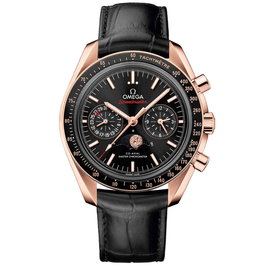 Ref. 304.63.44.52.01.001 - Die Speedmaster, die bei allen sechs Mondmissionen dabei war, gehört zu OMEGAs legendärsten Zeitmessern. In Anlehnung an den Entdeckergeist verfügt diese neue Moonphase über eine handgravierte Darstellung des Mondes. - Dieses 44,25 mm große Modell wartet mit einem schwarzen Zifferblatt mit Sonnenschliff und diamantpolierten Indizes und Zeigern aus 18 K Sedna™-Gold auf. Bei 6 Uhr findet sich die präzise Mondphasenanzeige, die durch eine mit Email gefüllte und in Anspielung auf die Sterne mit Silberstaub bestreute handgravierte Mondscheibe aus 18 K Sedna™-Gold besticht. - Diese Uhr mit Gehäuse aus 18 K Sedna™-Gold und Lünettenring aus schwarzer Keramik mit Tachymeterskala aus Ceragold™ ist mit einem schwarzen Lederarmband mit polierter und gebürsteter Faltschließe aus 18 K Sedna™-Gold ausgestattet. - Angetrieben wird der Zeitmesser von OMEGAs Co-Axial Master Chronometer-Kaliber 9905, das offiziell vom METAS zertifiziert wurde.