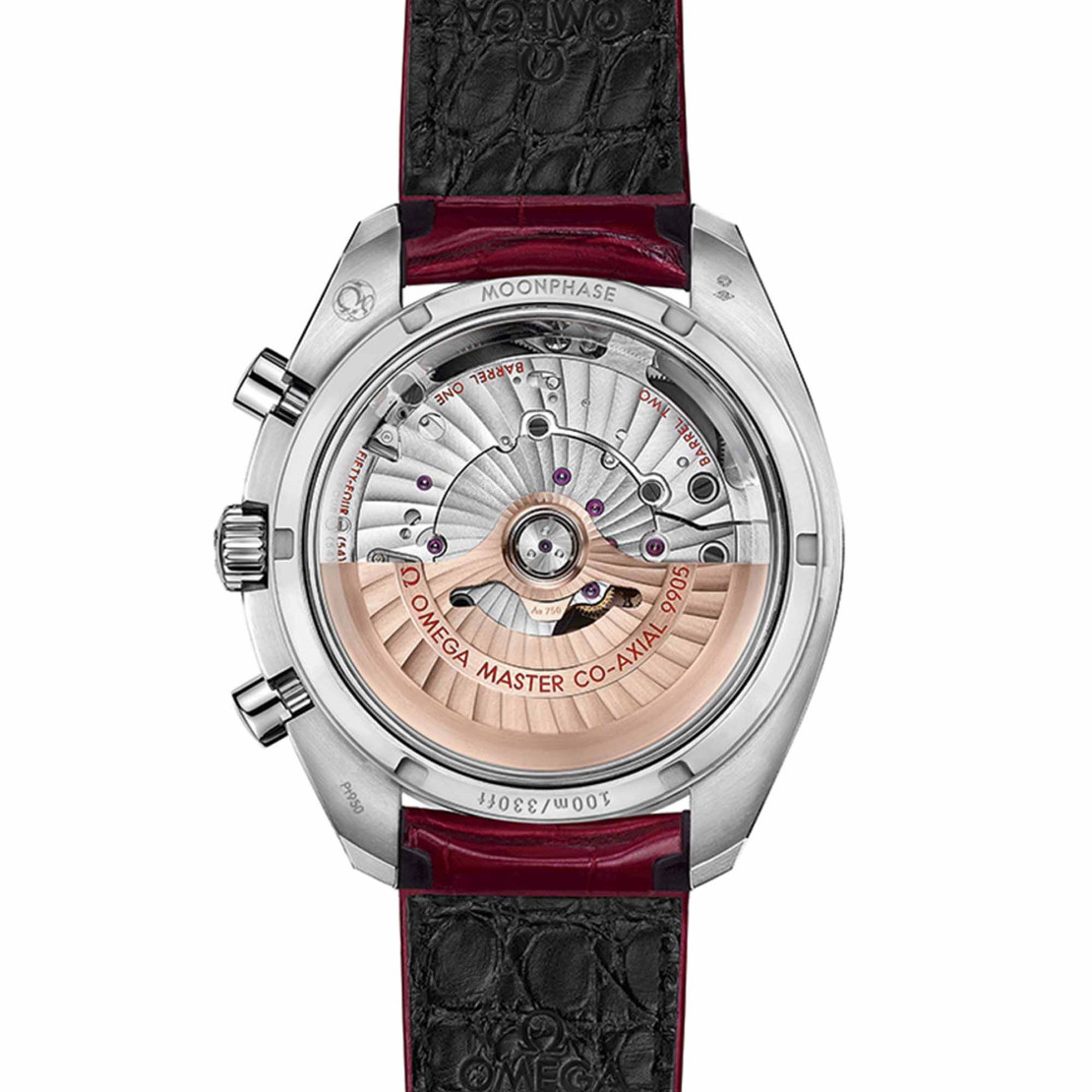 Roter Lünettenring aus Aluminiumoxid mit gebürsteter Tachymeterskala aus Platin und Liquidmetal™