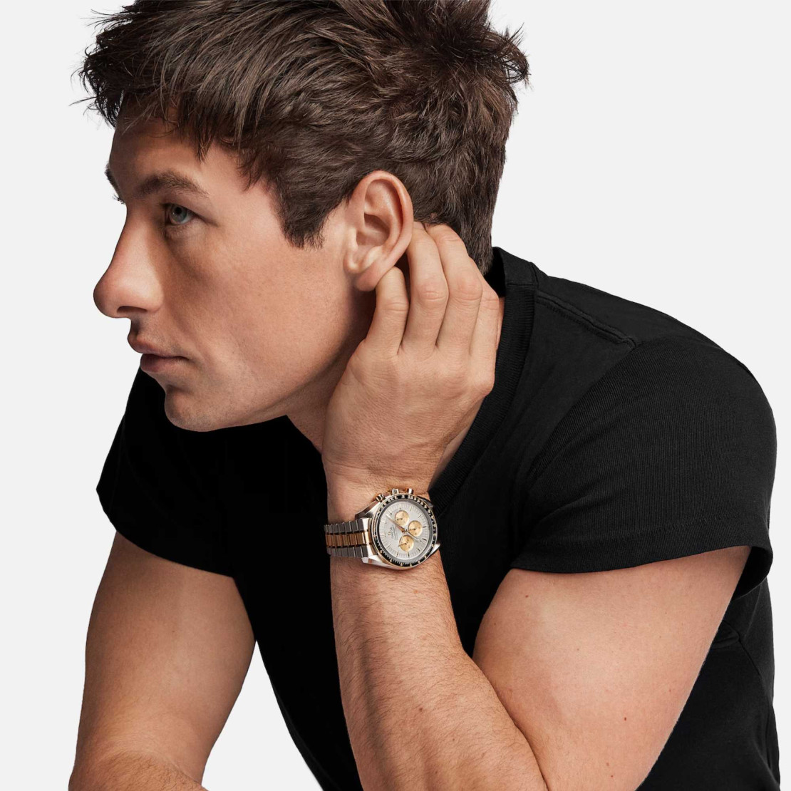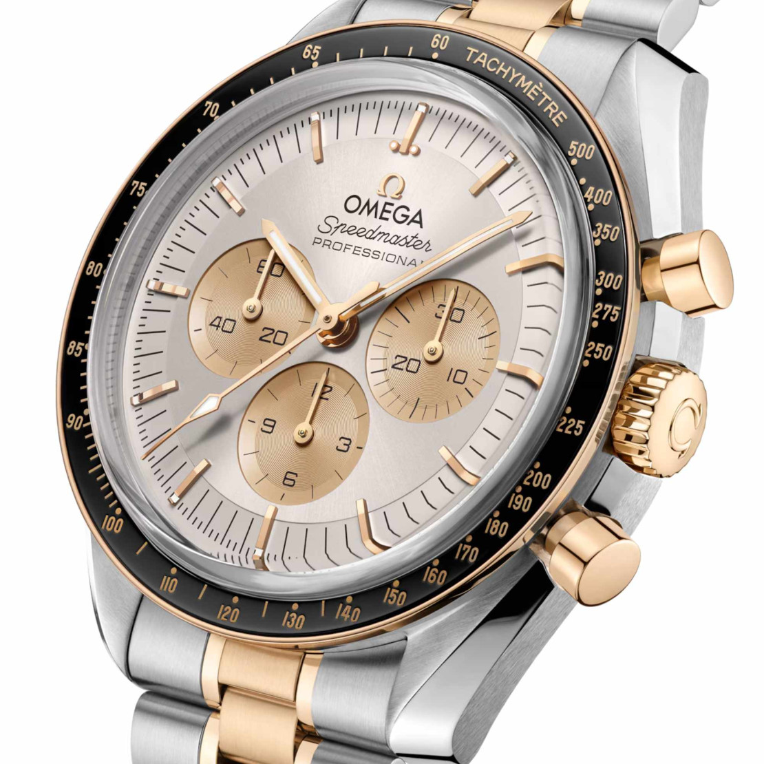Dieses 42-mm-Modell aus Edelstahl und 18 K Moonshine™-Gold ist sowohl auf der Vorder- als auch auf der Rückseite mit einem Saphirglas versehen. Es schöpft seine Inspiration aus der vierten Generation der Speedmaster und zeichnet sich durch ein asymmetrisches Gehäuse mit einem Lünettenring aus schwarzer Keramik, eine Tachymeterskala aus OMEGA Ceragold™ und den berühmten „Punkt über der 90“ aus.