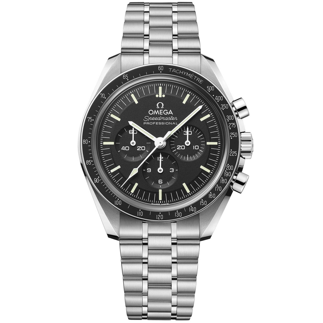 Ref. 310.30.42.50.01.002 - Die Speedmaster Moonwatch gehört zu den legendärsten Zeitmessern der Welt. Der beeindruckende Chronograph, der bei allen sechs Mondlandungen dabei war, verkörpert perfekt den risikofreudigen Pioniergeist der Marke. Das Armband dieser 42-mm-Moonwatch aus Edelstahl weist ein Design mit fünf gebogenen, polierten und gebürsteten Gliedern pro Reihe auf. Als Uhrglas und Gehäuseboden dient Saphirglas. Inspiriert von der 4. Generation der Speedmaster, die auf dem Mond getragen wurde, besitzt das Modell auch ein asymmetrisches Gehäuse mit appliziertem OMEGA Logo, ein schwarz abgestuftes Zifferblatt und den berühmten Punkt über der 90 auf dem Lünettenring aus eloxiertem Aluminium. Angetrieben wird die Uhr von dem OMEGA Co-Axial Master Chronometer Kaliber 3861, das neben der zentralen Chronographenfunktion über eine kleine Sekunde, einen 30-Minuten-Zähler und einen 12-Stunden-Zähler verfügt.