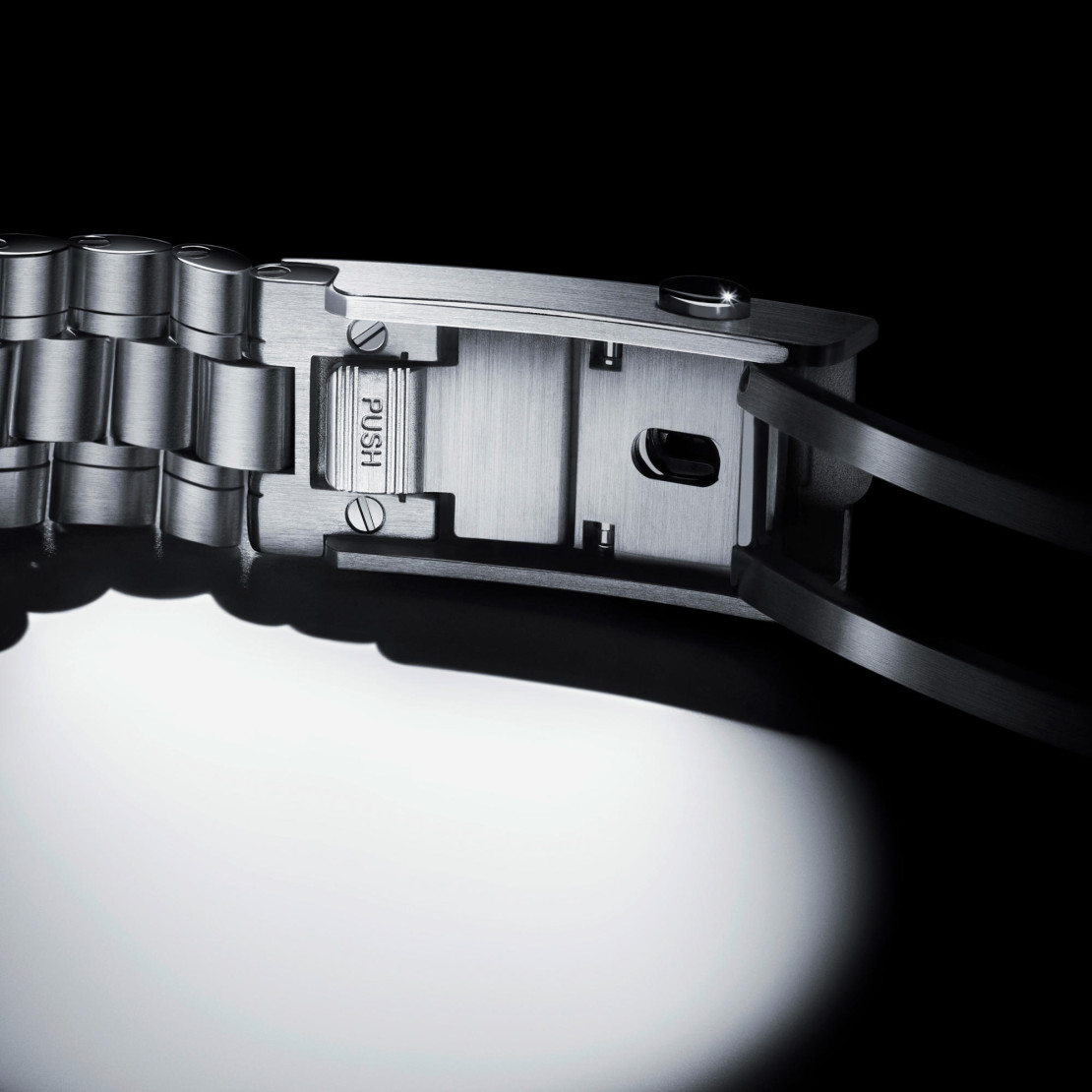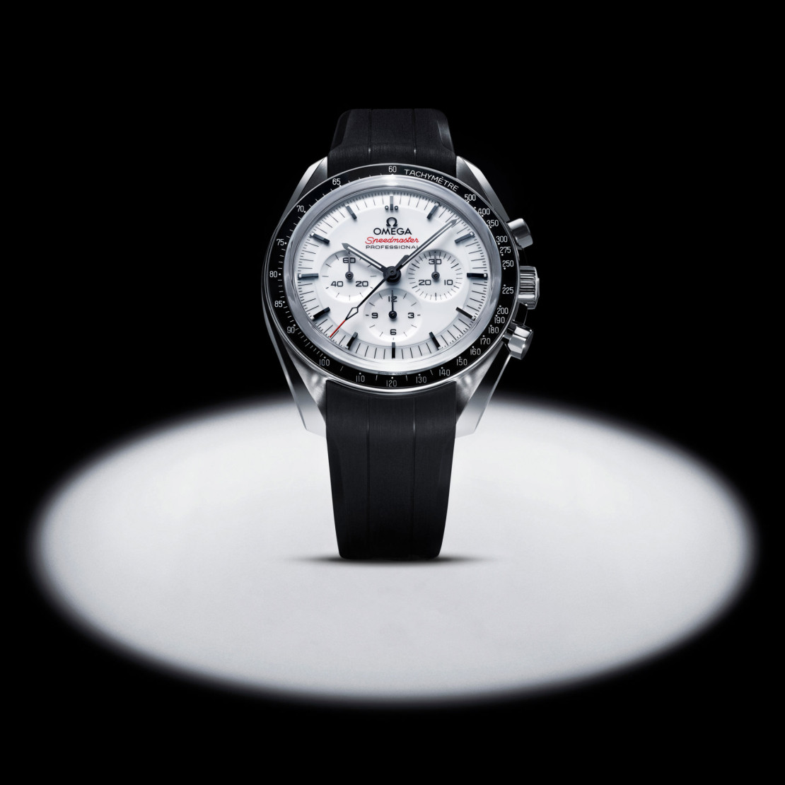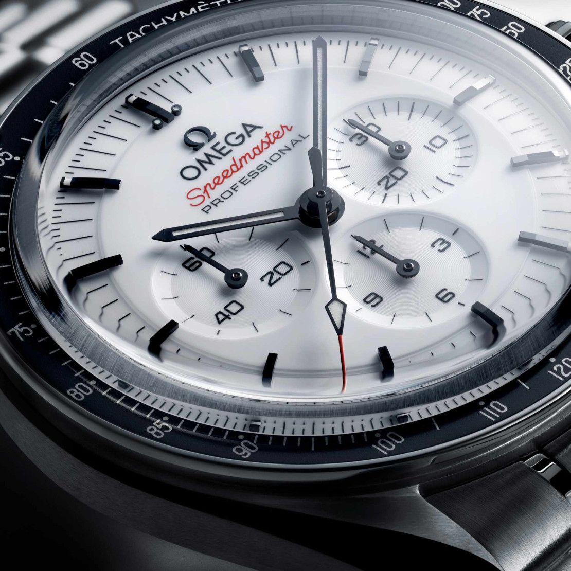 Diese 42-mm-Moonwatch aus Edelstahl wird von einem polierten und gebürsteten Metallarmband am Handgelenk gehalten. Als Uhrglas und Gehäuseboden dient Saphirglas. Inspiriert von der 4. Generation der Speedmaster, die auf dem Mond getragen wurde, besitzt das Modell auch ein asymmetrisches Gehäuse, ein weiß lackiertes, abgestuftes Zifferblatt mit appliziertem OMEGA Logo und applizierten Indizes, Zeiger im Moonwatch-Stil und den berühmten Punkt über der 90 auf dem Lünettenring aus schwarzem, eloxiertem Aluminium.