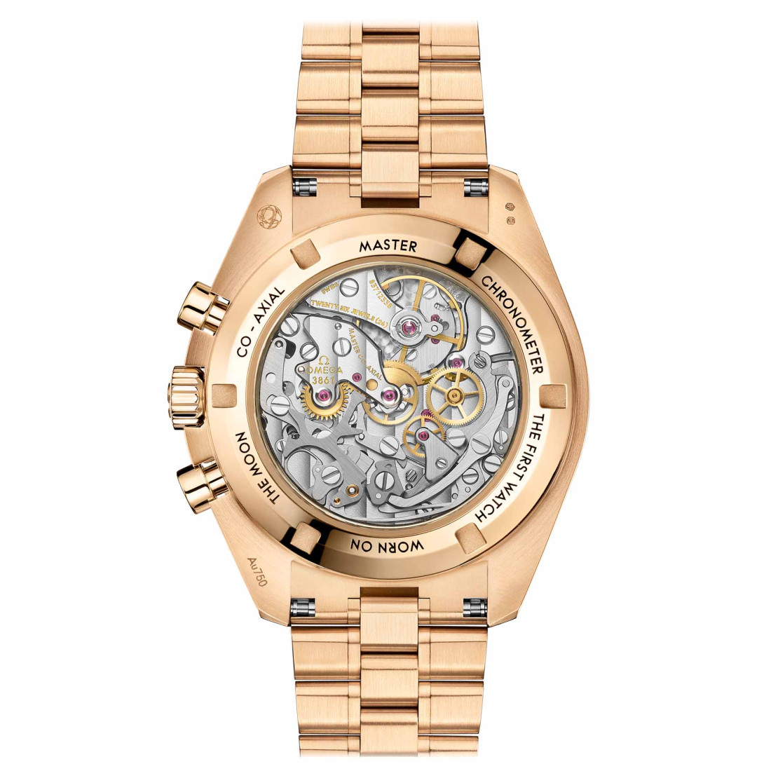 Ref. 310.60.42.50.10.001 - Die Speedmaster Moonwatch gehört zu den legendärsten Zeitmessern der Welt. Der beeindruckende Chronograph, der bei allen sechs Mondlandungen dabei war, verkörpert perfekt den Pioniergeist der Marke. Die von der 4. Speedmaster Generation inspirierte 42-mm-Moonwatch mit Gehäuse und Armband aus 18 K Moonshine™-Gold hat ein grünes „abgestuftes“ PVD-Zifferblatt und Zeiger im „Moonwatch“-Stil. Der grüne Keramik-Lünettenring mit OMEGA Ceragold™-Tachymeterskala ist mit dem berühmten „Punkt über der 90“ versehen. Der doppelt abgeschrägte Gehäuseboden aus poliertem 18 K Moonshine™-Gold ist mit den Worten FIRST WATCH WORN ON THE MOON in Schwarz graviert. Die Moonwatch wird von OMEGAs Co-Axial Master Chronometer Kaliber 3861 mit einem besonderen, luxuriösen Finish angetrieben.