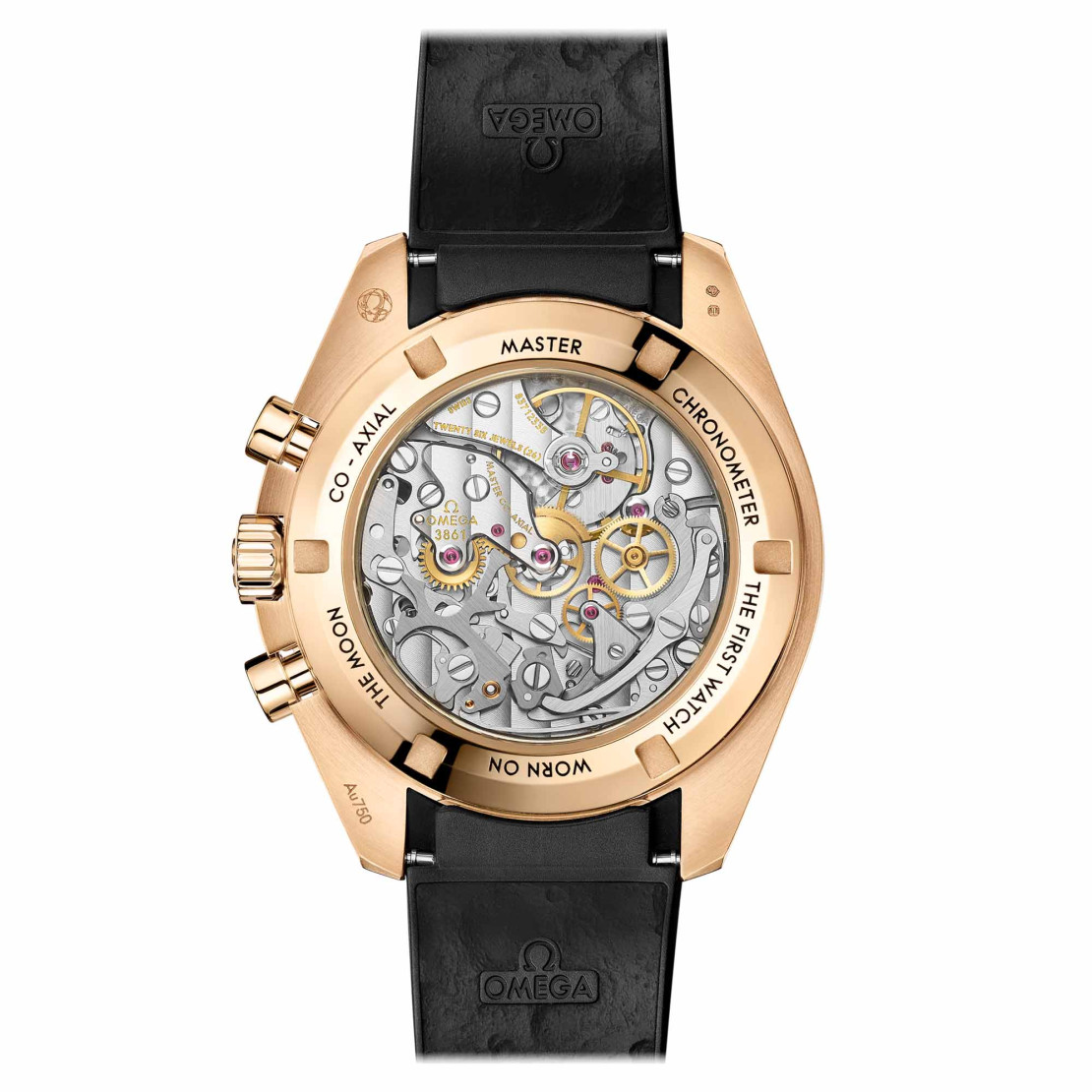 Ref. 310.62.42.50.99.001 - Die Speedmaster Moonwatch gehört zu den legendärsten Zeitmessern der Welt. Der beeindruckende Chronograph, der bei allen sechs Mondlandungen dabei war, verkörpert perfekt den Pioniergeist der Marke. Die von der 4. Speedmaster Generation inspirierte 42-mm-Moonwatch aus 18 K Moonshine™-Gold hat ein „abgestuftes“ Zifferblatt aus 18 K Moonshine™-Gold mit Sonnenschliff und schwarzen Hilfszifferblättern und Indizes. Der schwarze Keramik-Lünettenring mit OMEGA Ceragold™-Tachymeterskala ist mit dem berühmten „Punkt über der 90“ versehen. Als Hommage an ihre Geschichte ist die Unterseite des integrierten schwarzen Kautschukarmbandes mit einem Mondoberflächenmuster in positivem Relief versehen. Der doppelt abgeschrägte Gehäuseboden aus poliertem 18 K Moonshine™-Gold ist mit den Worten FIRST WATCH WORN ON THE MOON in Schwarz graviert. Die Moonwatch wird von OMEGAs Co-Axial Master Chronometer Kaliber 3861 mit einem besonderen, luxuriösen Finish angetrieben.