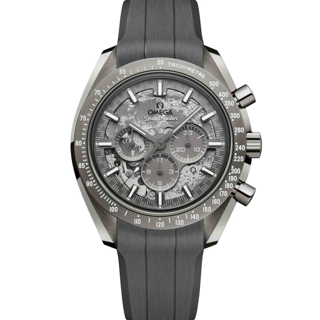 Ref. 310.92.44.50.06.002 - Als Hommage an OMEGAs Vermächtnis der Weltraumforschung verfügt diese Speedmaster Grey Side of the Moon über ein 44,25 mm großes Gehäuse aus polierter, grauer Keramik mit Plasmabeschichtung. Die gebürstete Lünette ist ebenfalls aus grauer Keramik gefertigt und verfügt über eine lasergravierte Tachymeterskala, die mit weißem Super-LumiNova gefüllt ist.