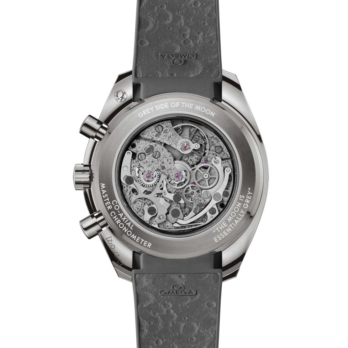Das speziell dekorierte Uhrwerk ist das OMEGA Co-Axial Master Chronometer Kaliber 3869, die Gravur auf dem Gehäuseboden enthält das Zitat THE MOON IS ESSENTIALLY GREY, das dem Pilot Jim Lovell während der Apollo 8 Mission zugeschrieben wird.