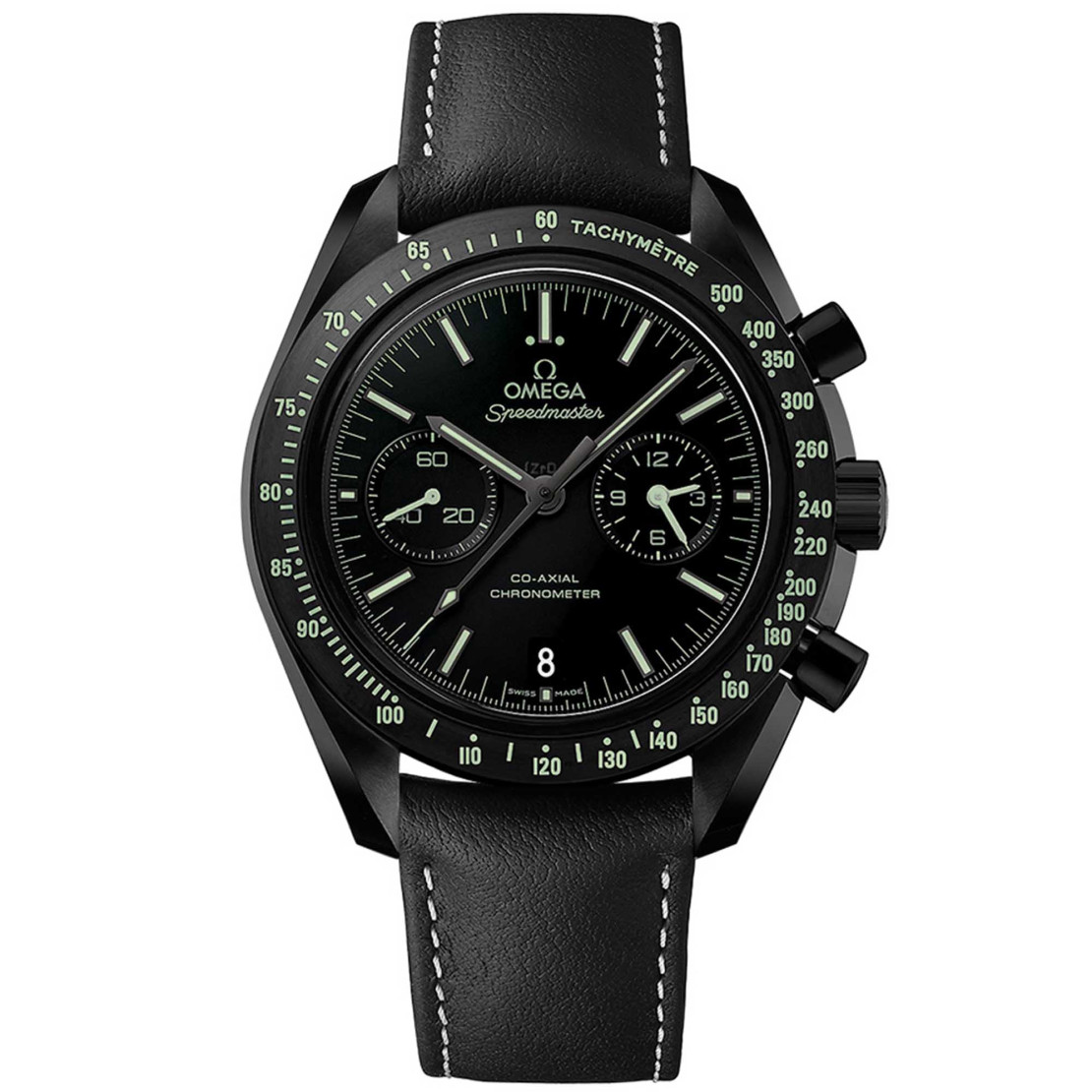 Ref. 311.92.44.51.01.004 - Die Abenteuer und Errungenschaften der Apollo-8-Astronauten waren es, die als Inspiration für die durchgehend in Schwarz gehaltene Speedmaster Dark Side of the Moon mit Keramikgehäuse dienten. Es war jedoch die mystische Aura des Nachtlichts der Erde und ihre ständig wechselnde, doch zugleich kontinuierliche Präsenz, die die Kreation der Speedmaster Dark Side of the Moon „Pitch Black“ beflügelte. - Dieses 44,25-mm-Modell verfügt über ein poliertes und gebürstetes Keramikgehäuse sowie über eine Lünette aus gebürsteter Keramik mit einer Tachymeterskala, die mit Super-LumiNova belegt ist. Es zeichnet sich durch das Super-LumiNova aus, mit dem die Indizes auf dem schwarzen Keramikzifferblatt beschichtet sind. Die mattschwarzen Hilfszifferblätter sind mit lackierten Zeigern ausgestattet. - Die „Pitch Black“ ist mit einem schwarzen Lederarmband mit ecrufarbener Absteppung und Keramikfaltschließe versehen. Ihr Herzstück ist das OMEGA Co-Axial Kaliber 9300.