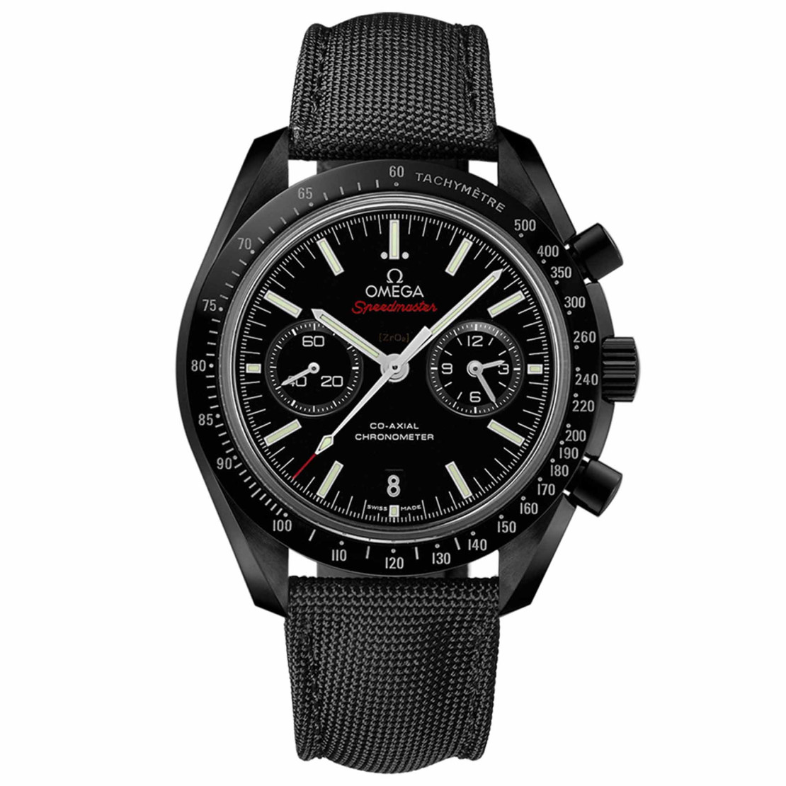 Ref. 311.92.44.51.01.007 - Diese robust wirkende Version der Moonwatch „Dark Side of the Moon“ kommt tief aus dem All. Das in einem Stück aus schwarzer Keramik gefertigte charakteristische 44,25-mm-Speedmaster-Gehäuse wird durch eine gebürstete Keramiklünette mit matter Chromnitrid-Tachymeterskala abgerundet. - Auch das Zifferblatt besteht aus polierter schwarzer Keramik und ist mit zwei Zählern bei 3 und 9 Uhr, die von applizierten geschwärzten Ringen umrahmt sind, sowie applizierten Indizes aus 18 K Weißgold versehen. - Am Handgelenk gehalten wird der markante Zeitmesser, der durch das OMEGA Co-Axial Kaliber 9300 angetrieben wird, durch ein schwarzes Nylonarmband, das eine neue Keramik-Titan-Faltschließe besitzt. Die Zeiger bestehen aus diamantpoliertem 18 K Weißgold. Eine Ausnahme bildet nur der polierte rhodinierte zentrale Sekundenzeiger mit roter Spitze.