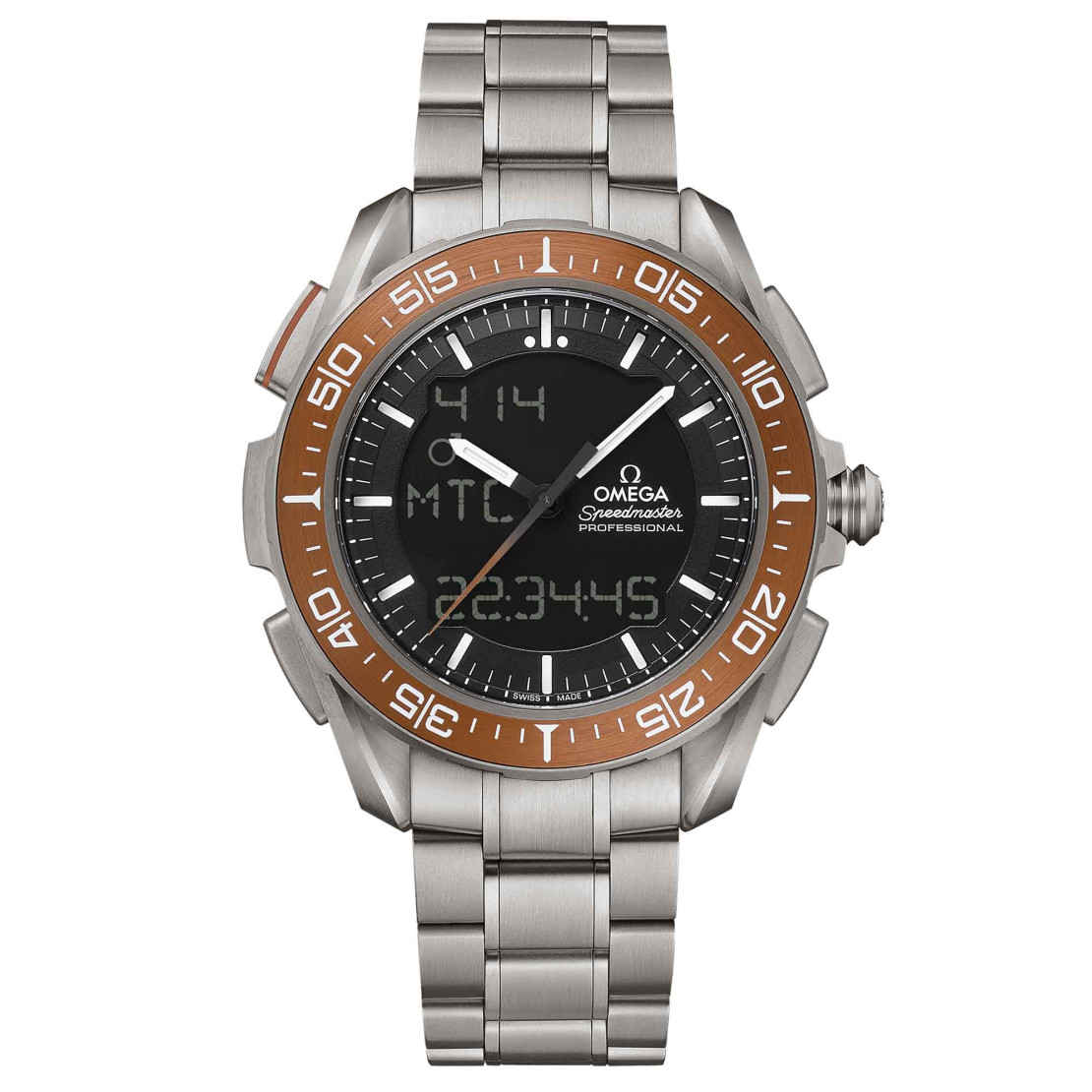 Ref. 318.90.45.79.01.003 - Die gemeinsam mit der Europäischen Weltraumorganisation (ESA) entwickelte OMEGA Speedmaster X-33 Marstimer ist alles, was ihr Name verspricht. Der einzigartige 45-mm-Chronograph besitzt ein Gehäuse aus Titan Grade 2 und wird von einem multifunktionalen Quarzwerk angetrieben. Er erfasst Zeiten und zeigt verschiedene Zeitzonen sowohl auf unserer Erde als auch auf dem geheimnisvollen roten Planeten an. Die MTC-Funktion zeigt den Marstag und die Uhrzeit auf dem Mars am Nullmeridian an, wobei die um 2,7 % längeren Tage auf dem Nachbarplaneten berücksichtigt werden. Außerdem ist die Uhr mit einem innovativen Sonnenkompass ausgestattet, um den Norden auf Erde und Mars zu finden. Ihr klassisches schwarzes Zifferblatt bildet einen kontrastierenden Hintergrund für die analogen und digitalen Anzeigen, die durch Symbole für Erde und Mars zur Unterscheidung, welche Funktionen gerade verwendet werden, noch leichter ablesbar sind. Umrahmt wird das Zifferblatt von einem Lünettenring aus mit Oxalsäure eloxiertem Aluminium und Roteisenstein, der an den charakteristischen Staub auf dem Mars erinnert. Dieser faszinierende Farbton wird auch von dem Sekundenzeiger aufgegriffen, der einen Farbverlauf von Schwarz zu Rot aufweist. Wendet man die Uhr, kommt ein Gehäuseboden zum Vorschein, der in der Mitte mit OMEGAs berühmtem Speedmaster-Schriftzug und einem Seepferdchen-Logo geprägt ist. Umrandet wird die Prägung von den Worten SPEEDMASTER X-33 MARSTIMER, ESA TESTED AND QUALIFIED. Für den Antrieb sorgt OMEGAs Kaliber 5622.