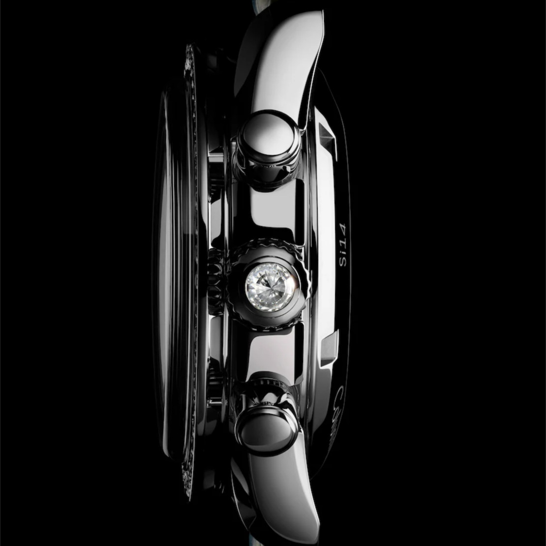 Das Zifferblatt mit grüner PVD-Beschichtung verfügt über horizontal ovale Hilfszifferblätter mit silberfarbener Beschichtung und ein vertikal ovales Datumsfenster bei 6 Uhr. Die Zeiger für Stunden und Minuten sind diamantpoliert, rhodiniert und mit weißer, grün leuchtender Super-LumiNova gefüllt.