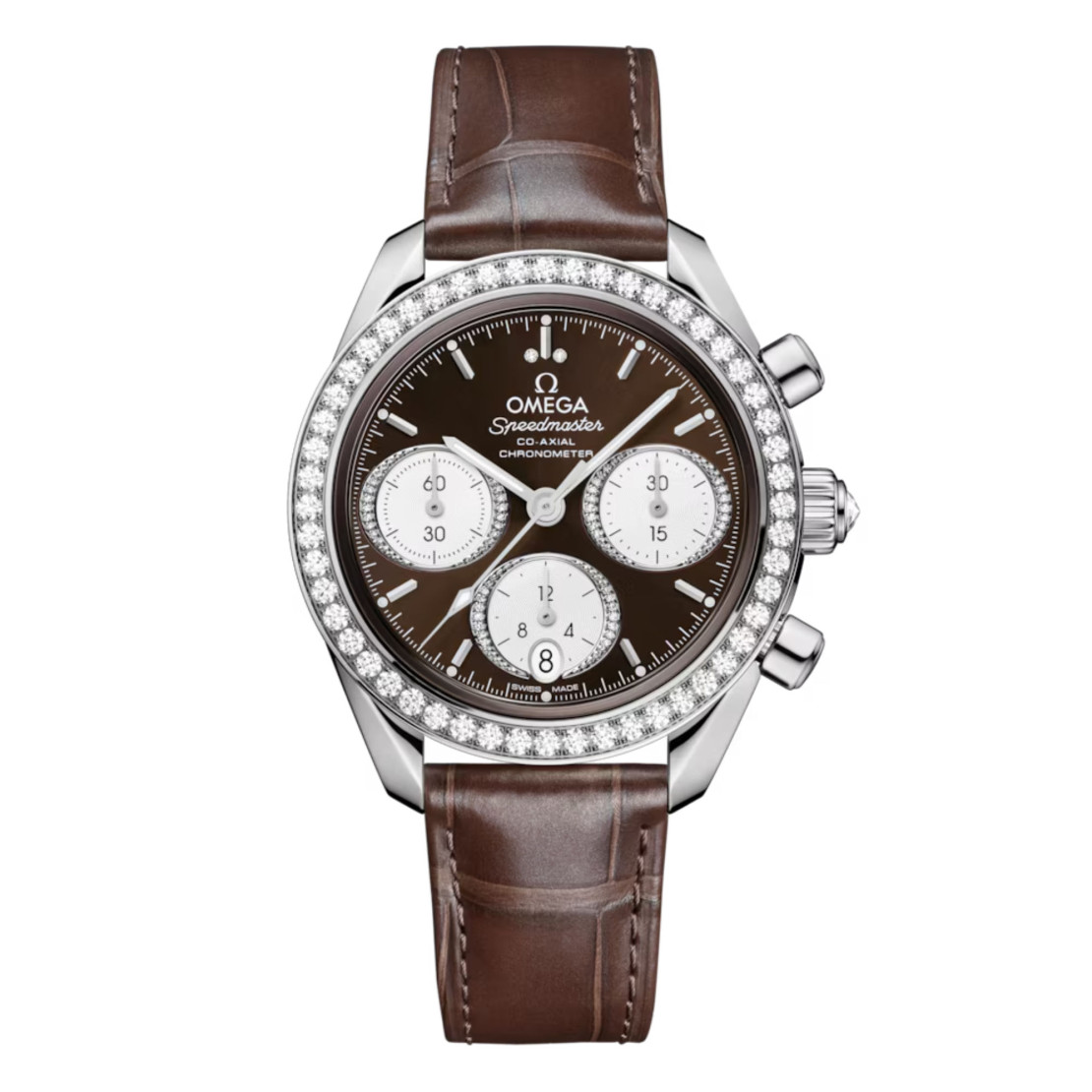 Dieses Modell mit einem vollständig polierten Gehäuse aus Edelstahl besitzt eine mit 52 Diamanten besetzte Lünette und eine polierte Krone, in die ein einzelner Diamant gefasst wurde.