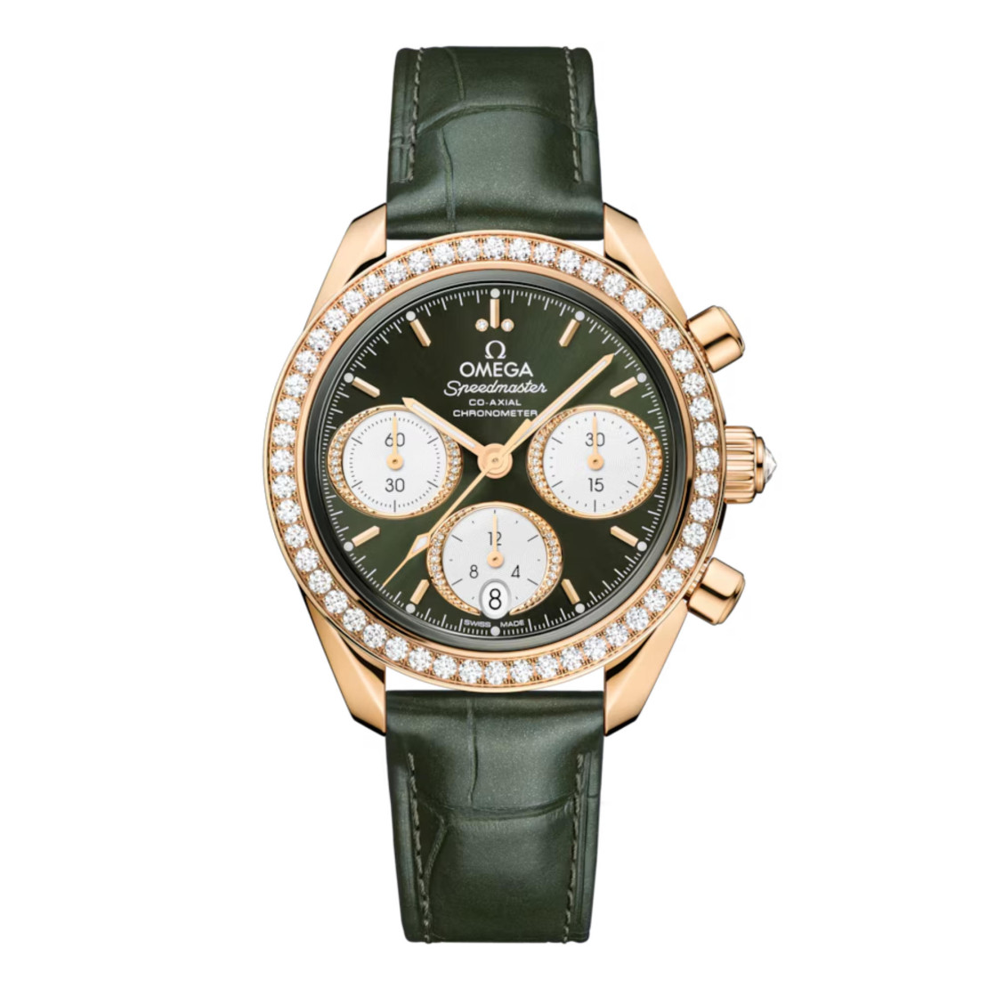Am Handgelenk gehalten wird die Uhr von einem grünen Lederarmband mit einer Faltschließe aus 18 K Moonshine™-Gold. Ihr verschraubter Gehäuseboden ist mit einem eingeprägten Seepferdchen-Medaillon versehen. Für den Antrieb sorgt das OMEGA Co-Axial Kaliber 3330.