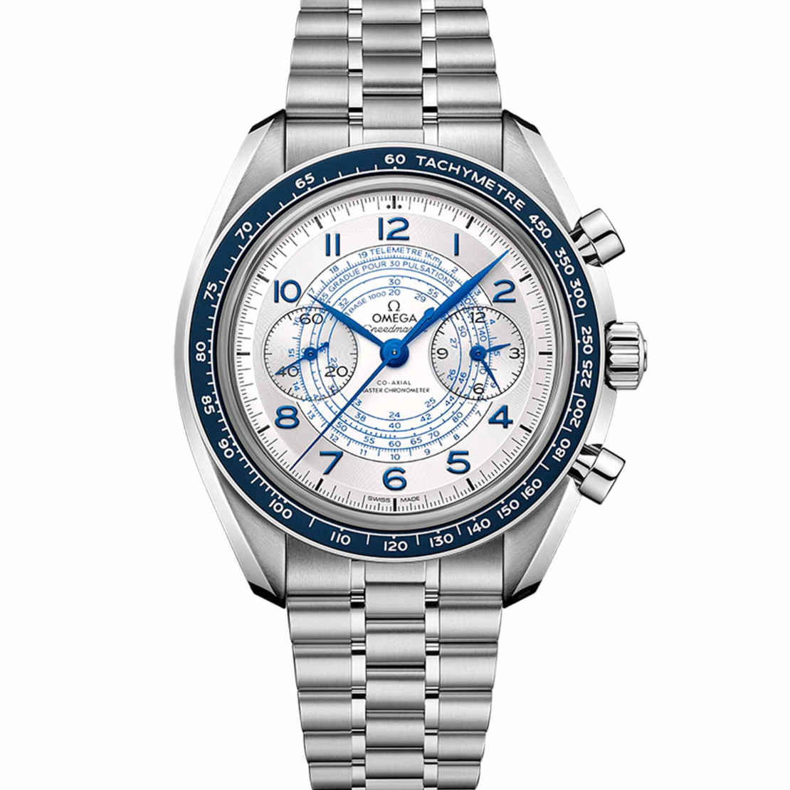 Ref. 329.30.43.51.02.001 - Die Kollektion Chronoscope hat das legendäre Design der Speedmaster übernommen und es mit Inspirationen aus OMEGAs Armbandchronographen der 1940er-Jahre kombiniert. Dieses 43-mm-Modell ist aus Edelstahl gefertigt und verfügt über ein silberfarbenes Zifferblatt. Neben dem Lünettenring aus blau eloxiertem Aluminium mit Tachymeterskala wurden auch die Blattzeiger und die arabischen Ziffern gebläut. Unter den Ziffern ist ein einzigartiges „Spiralmuster“ zu sehen. Darüber hinaus wurde das Zifferblatt mit drei charakteristischen Skalen im „Schneckendesign“ der 1940er-Jahre bedruckt, darunter eine Tachymeterskala, eine Pulsometerskala und eine Telemeterskala. Die Uhr wird von einem Edelstahlarmband am Handgelenk gehalten und weist eine kleine Sekunde bei 9 Uhr sowie einen 60-Minuten- und 12-Stunden-Zähler bei 3 Uhr auf. Angetrieben wird der Zeitmesser von dem OMEGA Co-Axial Master Chronometer Kaliber 9908.