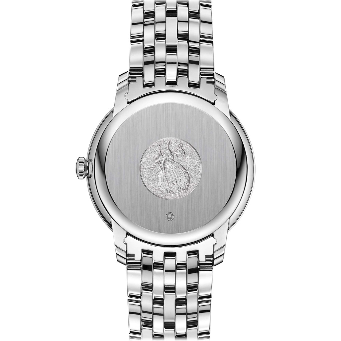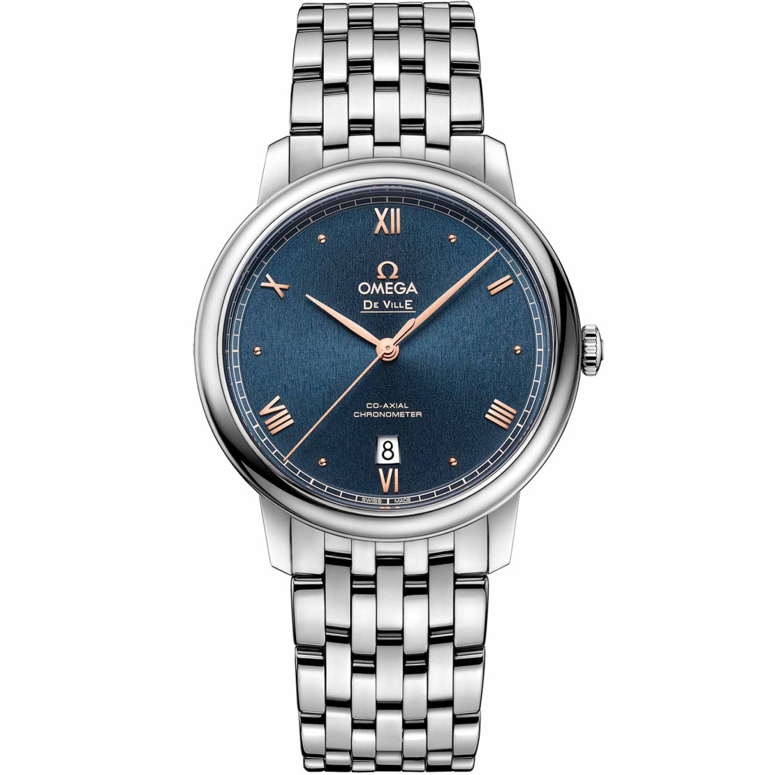 Ref. 424.10.40.20.03.004 - Die beliebte OMEGA De Ville Prestige Kollektion konnte sich im Laufe der Jahre dank ihres klassisch-eleganten Designs eine große und treue Anhängerschaft sichern. Dieses Modell aus Edelstahl ist mit einem Zifferblatt mit blauer PVD-Beschichtung und Sonnenschliff auf einer geprägten, vertikalen Struktur ausgestattet, die von einer „Eisenbahn“-Minuterie umgeben ist. Es besitzt ein Datumsfenster bei 6 Uhr, und das applizierte OMEGA Logo, die alternierenden römischen Ziffern und Cabochons sowie die Zeiger sind mit Rotgold vergoldet. Um das kratzfeste Saphirglas herum ist eine Lünette aus Edelstahl zu sehen, die an dem 39,5-mm-Gehäuse befestigt ist. Die Uhr wird an einem Prestige-Armband aus Edelstahl präsentiert. Das Herzstück dieses Zeitmessers bildet das OMEGA Co-Axial Kaliber 2500.