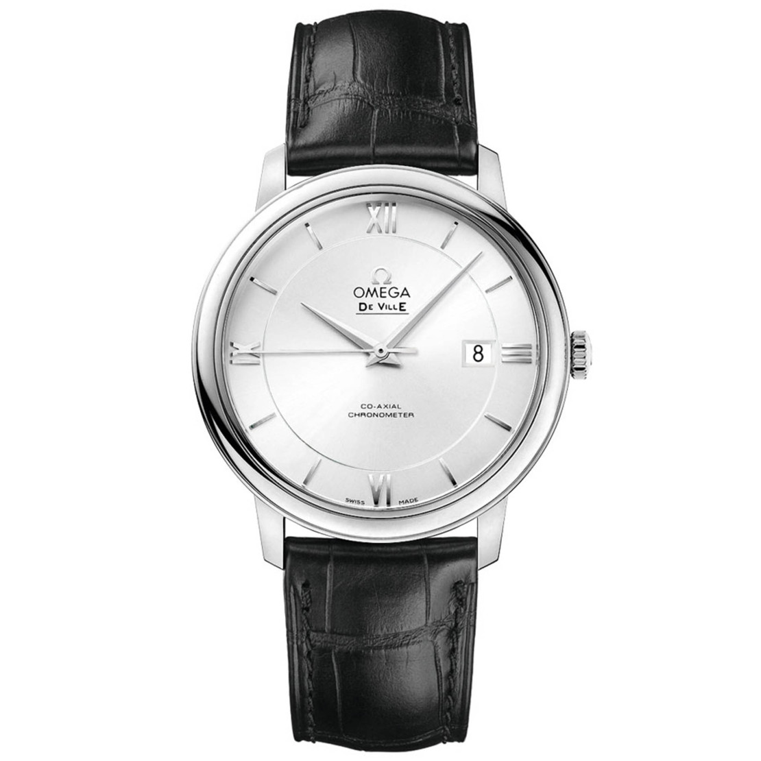 Ref. 424.13.40.20.02.001 - Die OMEGA De Ville Prestige-Kollektion konnte sich im Laufe der Jahre dank ihres klassisch-eleganten Designs eine große und treue Anhängerschaft sichern. Diese Zeitmesser, die sich durch ihren reinen Stil mit luxuriöser Endverarbeitung auszeichnen, verkörpern ein zeitloses Design. Dieses Modell verfügt über ein bemerkenswertes, aus zwei voneinander abgesetzten Zonen bestehendes, silberfarbenes Zifferblatt mit römischen Ziffern bei 3, 6, 9 und 12 Uhr. Ein kratzresistentes Saphirglas schützt das eindrucksvolle Zifferblatt mit Datumsfenster bei 3 Uhr. Die Lünette ist auf einem 39,5-mm-Gehäuse aus Edelstahl mit schwarzem Lederarmband angebracht. Das Herzstück dieses Zeitmessers bildet das Co-Axial Kaliber 2500.
