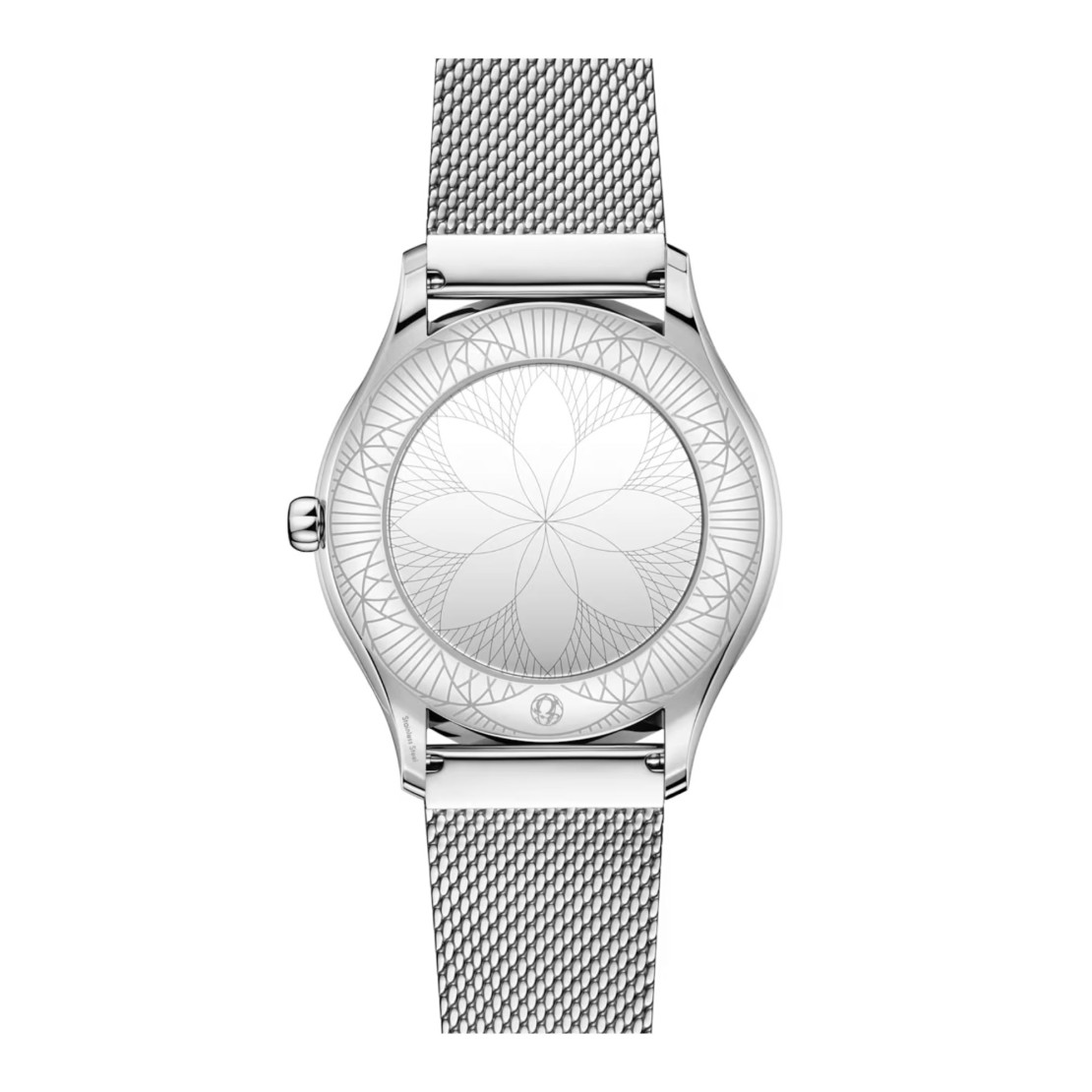Die vom OMEGA Kaliber 4061 angetriebene Uhr präsentiert sich mit einem verspiegelten Gehäuseboden mit metallisiertem „Her Time“-Muster und einem Milanaise-Armband aus Edelstahl mit Seidenprägung.
