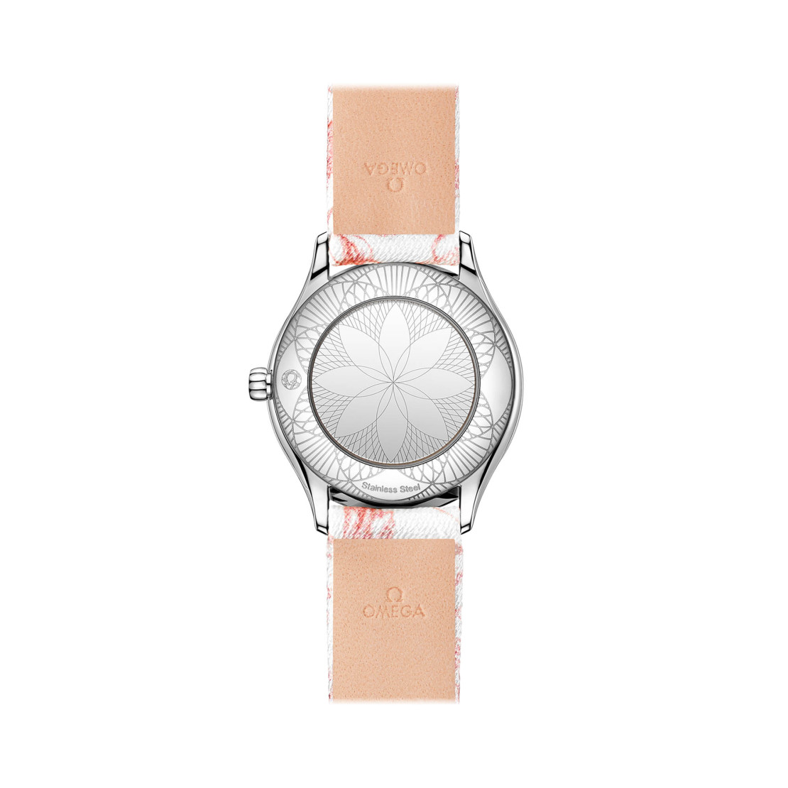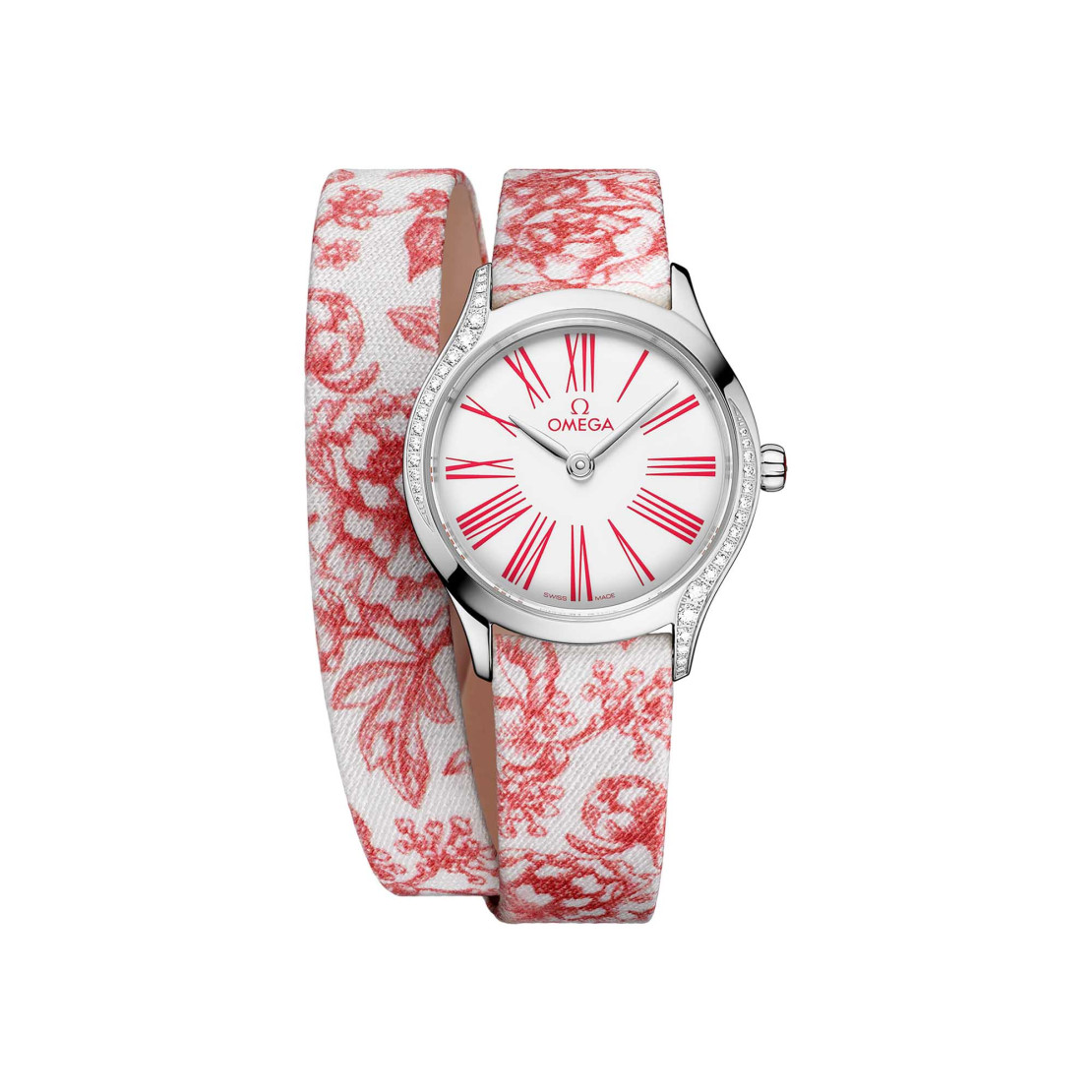 Ref. 428.17.26.60.04.003 - Die Mini Trésor ist eine feinere Version von OMEGAs modernster Damenkollektion. Mit ihrer kompakten Größe und ihrem dynamischen Stil ist sie ein echter Blickfang am Handgelenk. Dieses Modell aus Edelstahl besitzt ein 26-mm-Gehäuse mit einem elegant geschwungenen Diamantbesatz an jeder Seite. Die Krone ist mit einem einzelnen Diamanten besetzt, der von einer Blume aus roter Flüssigkeramik umrahmt wird. Das gewölbte Zifferblatt wurde aus cremefarbenem „Grand Feu“-Email gefertigt und ist mit diamantpolierten, rhodinierten Zeigern sowie in Rosa aufgedruckten römischen Ziffern versehen. Die Uhr wird von einem einzigartigen, doppelt gewundenen Armband aus „Toile de Jouy“ mit rotem Blumen-Design am Handgelenk gehalten. Für den Antrieb sorgt das OMEGA Kaliber 4061, das sich hinter einem metallisierten Gehäuseboden aus Saphirglas mit Spiegeleffekt und „Her Time“-Motiv verbirgt.
